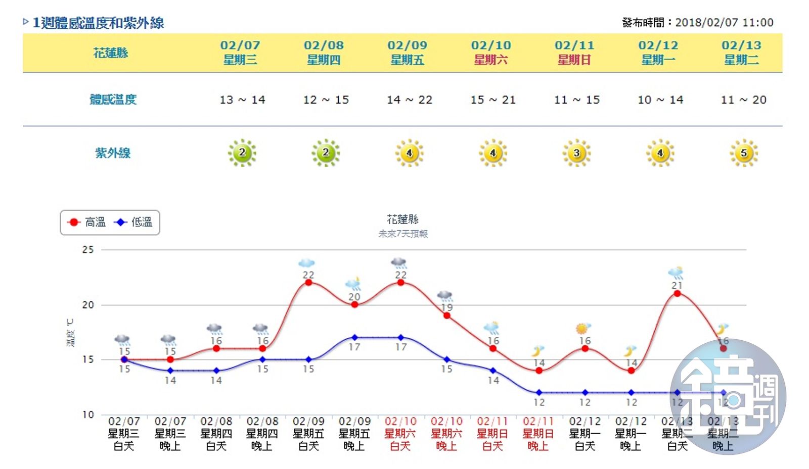 未來幾天是黃金救援期間,但花蓮天氣不穩定,尤其是入夜後仍會感到寒冷,提醒搜救人員與民眾都要注意保暖。(翻攝自中央氣象局)發布時間:2018.02.07 17:18 臺北時間