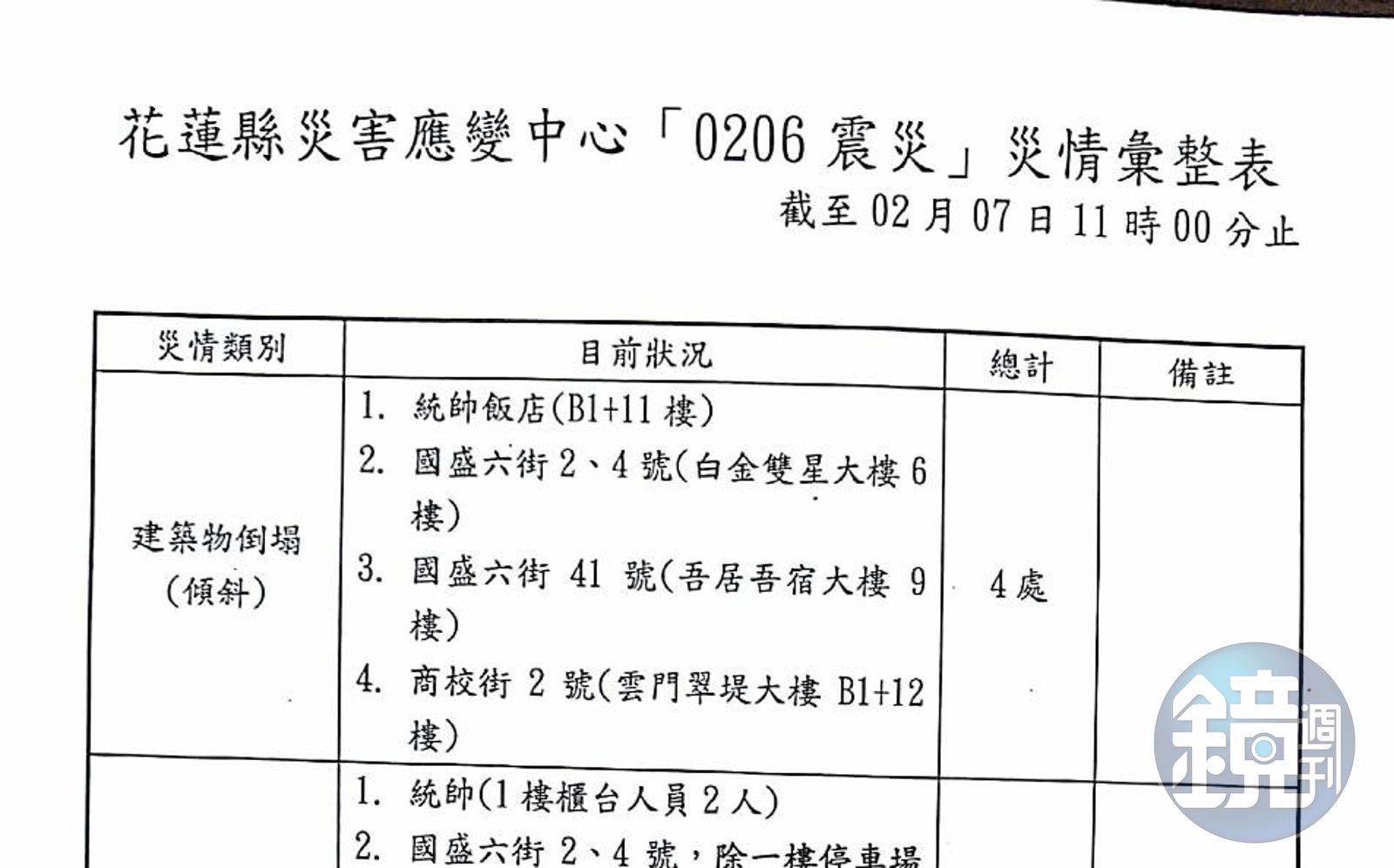 罹難者中,60歲的女性是在統帥飯店中尋獲;66歲男性是自宅送醫;雲門翠堤找到的2人身分仍待確認。 此外,在交通部分,七星潭大橋封閉;花蓮大橋則戒護通行;台9線已全線通車;花193線月眉段29.5K落石坍方無法通行;台8線封路;道路損壞40處(包含突起、龜裂);鐵路則可正常行駛。