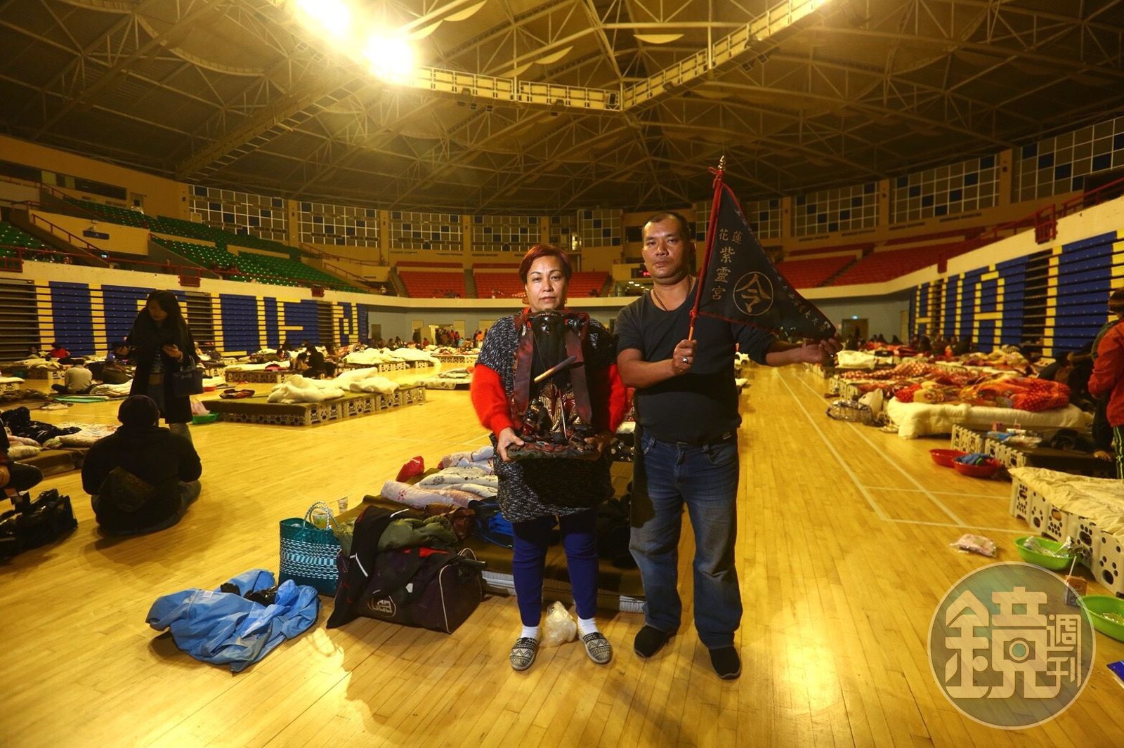 另也有隔日連神明一同抱來的人,說是神明指示必須搬離原址。現場也有許多孩子看似不知災情於現場奔跑嬉戲,莊嚴和嬉戲共處一室。記者在晚上7點多抵達,現場有不少救助單位發放雞排、麻油雞等晚餐,但有不少民眾已在臨時鋪設的床舖上入睡,可見前夜皆無法好好休息。