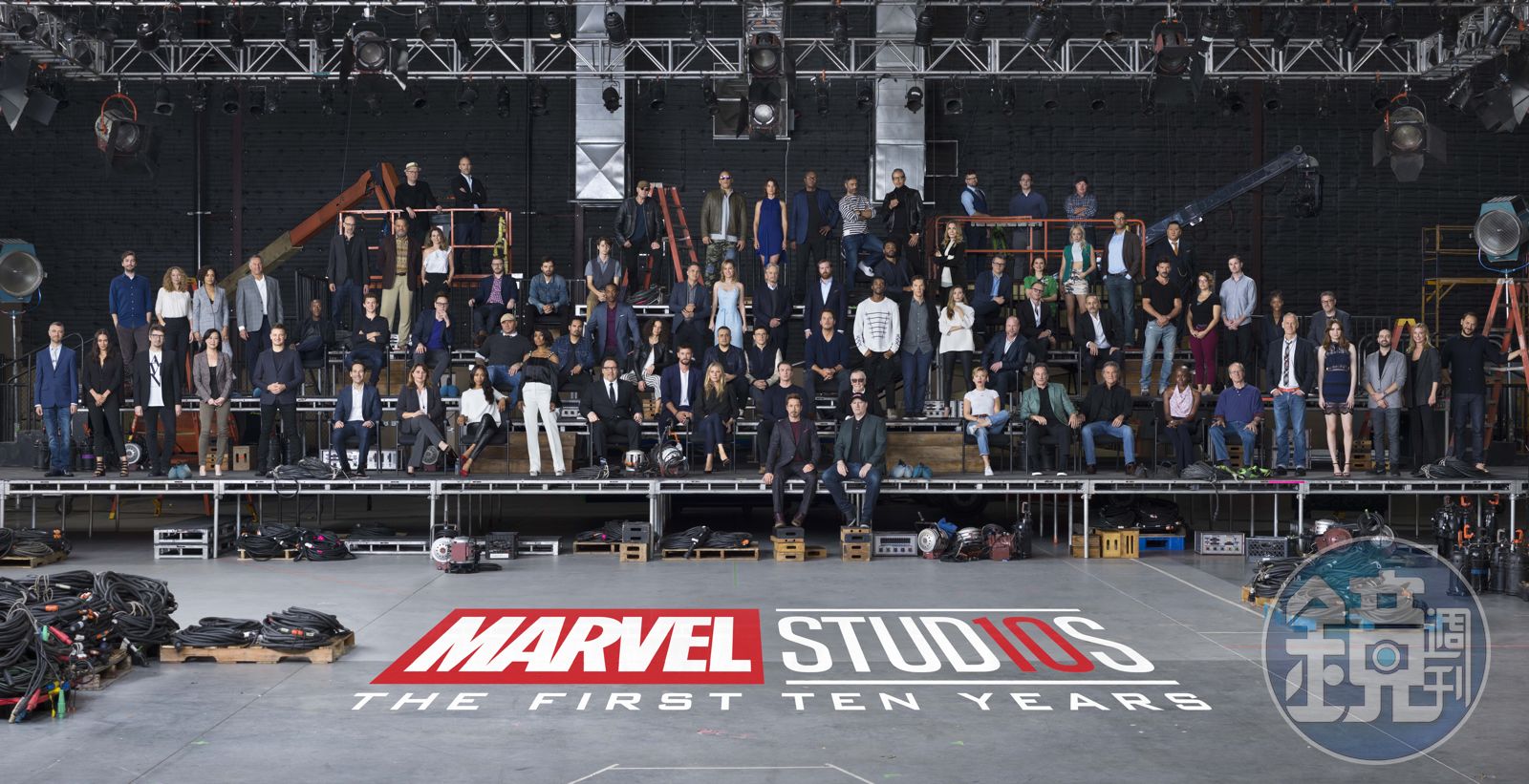 這場漫威電影宇宙的10年歡樂大拜拜,去年10月7日藉拍攝《復仇者聯盟3:無限之戰》之便,將80位幕前幕後人員齊聚一堂。位在鏡頭最前面的,當時是為漫威打下天下的「鋼鐵人」小勞勃道尼,及現任漫威影業總裁凱文費吉這2位大功臣,在他們身後的第一行正中央位置,則有高齡95歲的「漫威之父」史丹李、「美國隊長」克里斯伊凡、「小辣椒」葛妮絲派特洛、「雷神索爾」克里斯漢斯沃、「黑寡婦」史嘉蕾喬韓森、《鋼鐵人》導演、也是東尼史塔克保鑣「Happy」的強法夫洛等元老。其中「雙克里斯」不僅在MCU初期擔當了門面,也是漫威的先鋒部隊,如今隨著《復仇者聯盟4》殺青,2人與漫威的合約結束,這張照片更像是2人的「畢業照」。