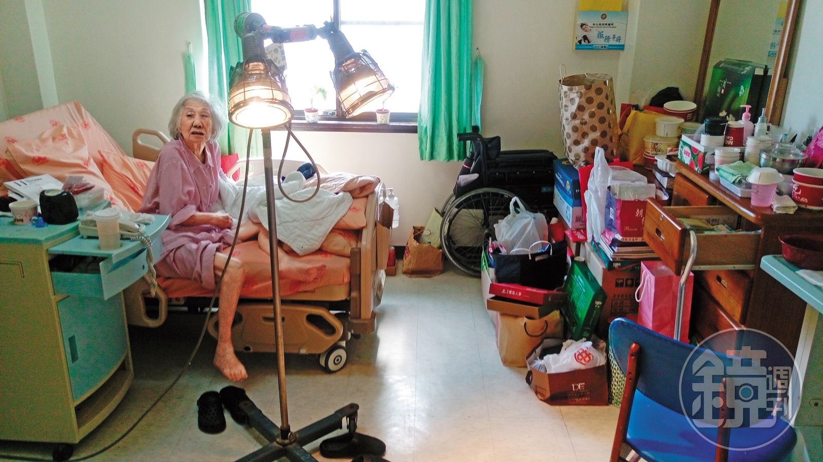 老奶奶說:「我的醫生、我的醫院都是在美國耶!」本刊詢問老奶奶,是否考慮至安養機構或回家休養?她強調,自己動不了,而且台灣的看護是歐巴桑,大都是50歲以上,有的看護還會虐待病人,她無法接受。