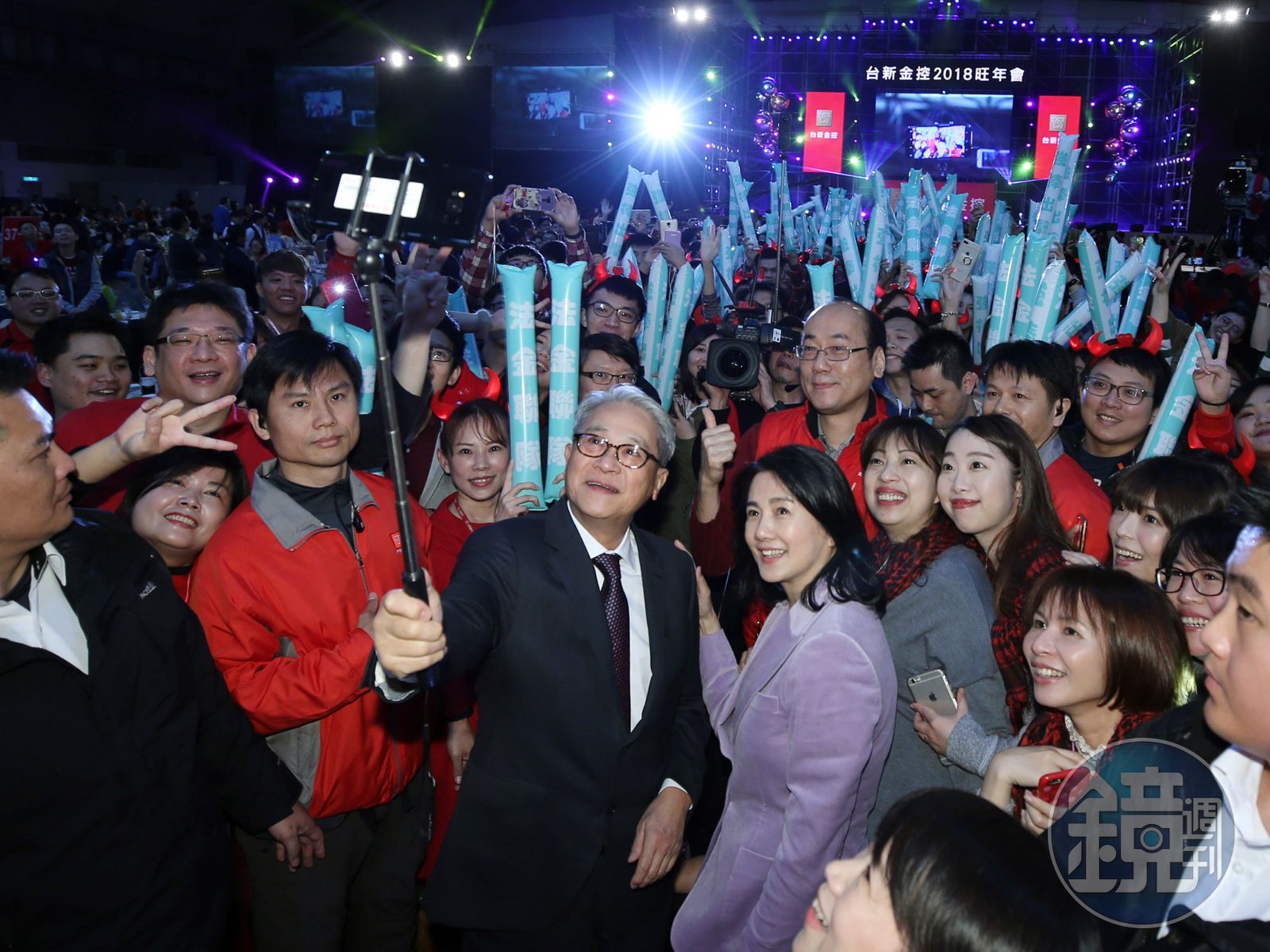 或許是因為賣了3個多月的豪宅終於脫手,難得出現在公開場合的彭雪芬,1月27日出席台新金控在南港展覽館舉辦的旺年會時,和夫婿、台新金董事長吳東亮拿起自拍棒和同仁拍照,夫妻倆充分展現親和力,心情顯得相當好。