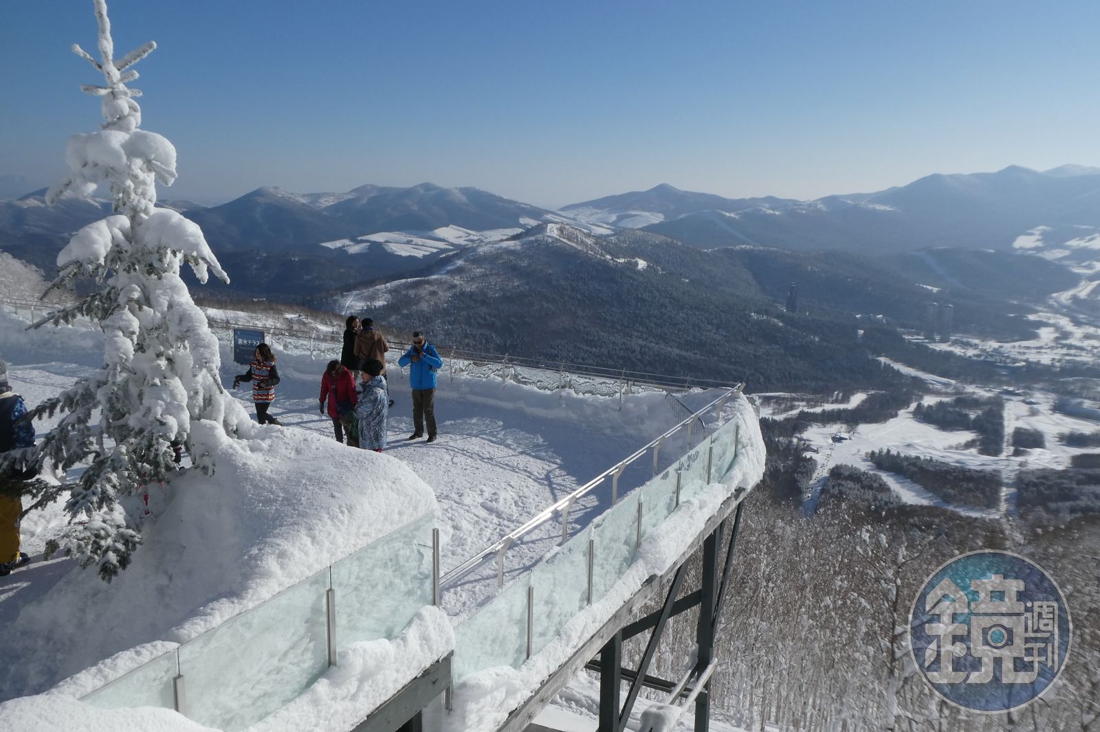 第一次去霧冰平台,天空飄著微雪,一片雪白的世界感覺很浪漫,沿著路線走到另一邊的圓形觀景台,由於造型獨特,又是另一種視覺感受,在此看著滑雪者奔馳、小朋友玩雪及一望無際的雪白美景,真有點捨不得搭纜車回到平地。