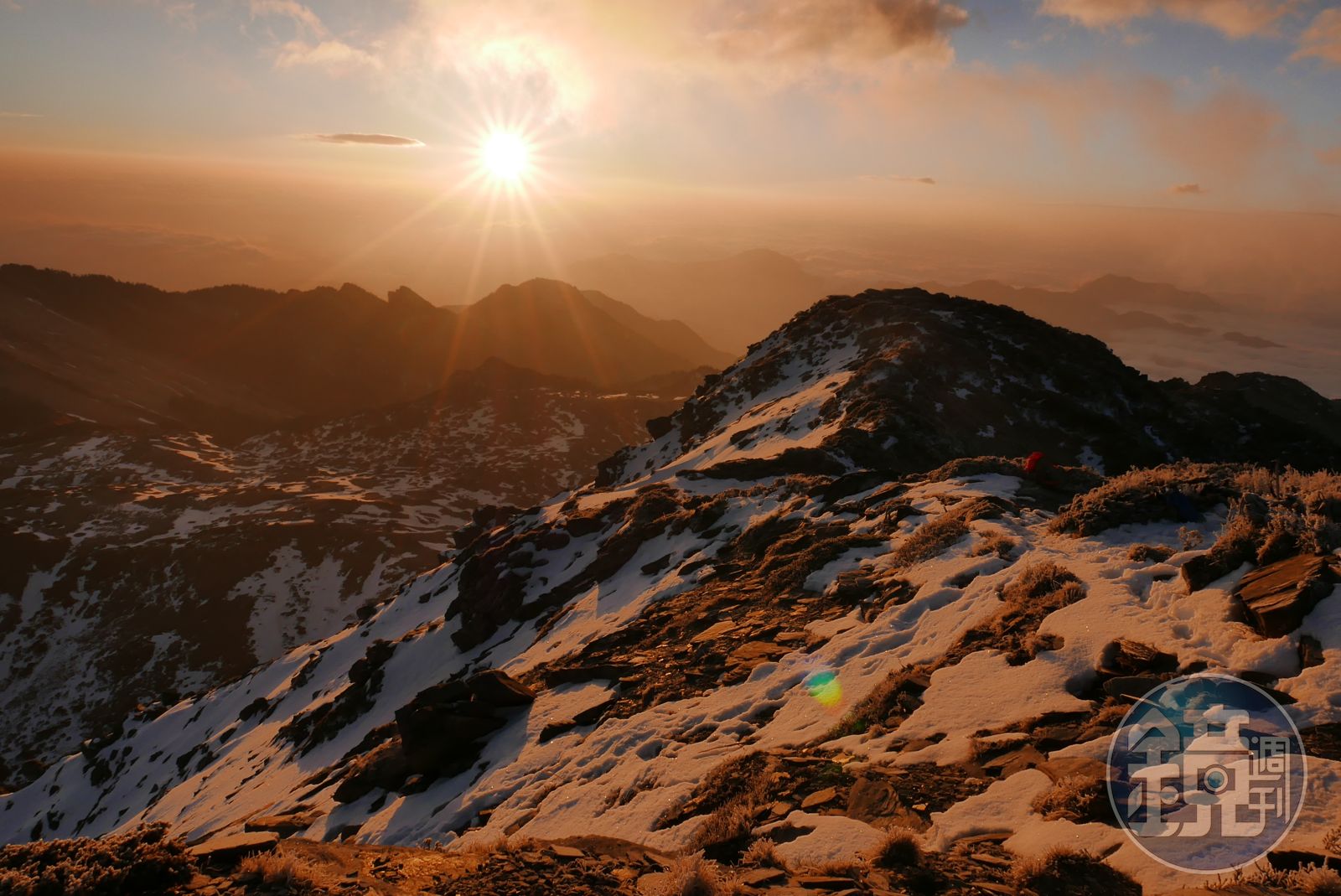 山頂等日出是最冷時刻,待太陽升起的那一刻,金黃色澤照映在白雪之上,美得令人睜不開眼,二天的辛苦瞬間化為烏有,這就是登山者一再追尋的快樂時光。