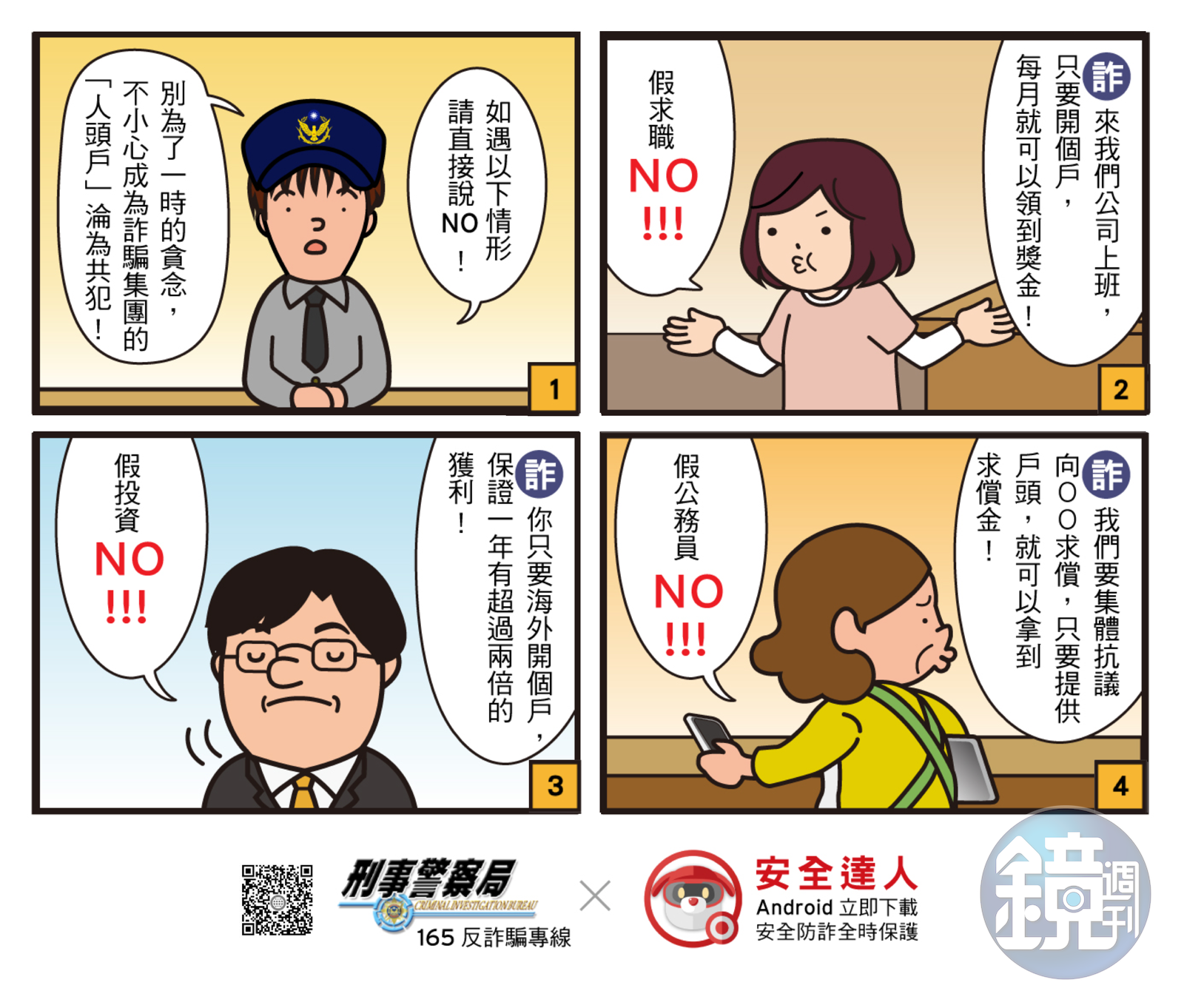 刑事局指出,民眾無論求職或借貸,過程中必須充分了解職缺內容是否合法,也可至經濟部商業司查詢有無登記,若對方無法提供公司名片、地址、電話等基本資訊時,務必提高警覺;如不幸將帳戶交付給詐騙集團,可儘速金融機構將帳戶辦理結清,以免遭不肖之徒利用。