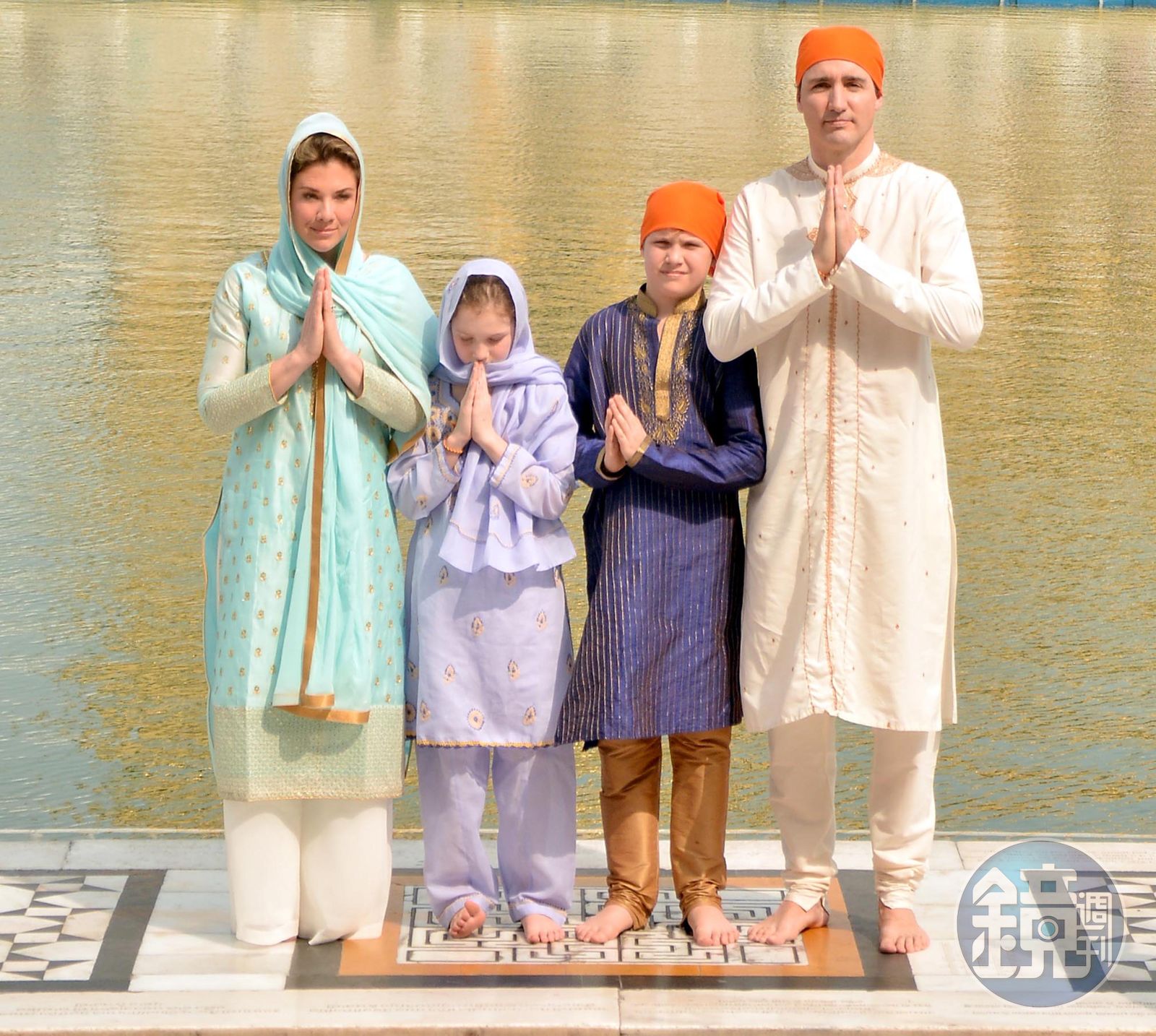 穿著印度新郎禮服的杜魯多和穿著傳統印度新娘身紅禮服的鄧肯站在印度神廟外頭,杜魯多還戴著結婚項鍊(印度婚禮風俗)。真完美。