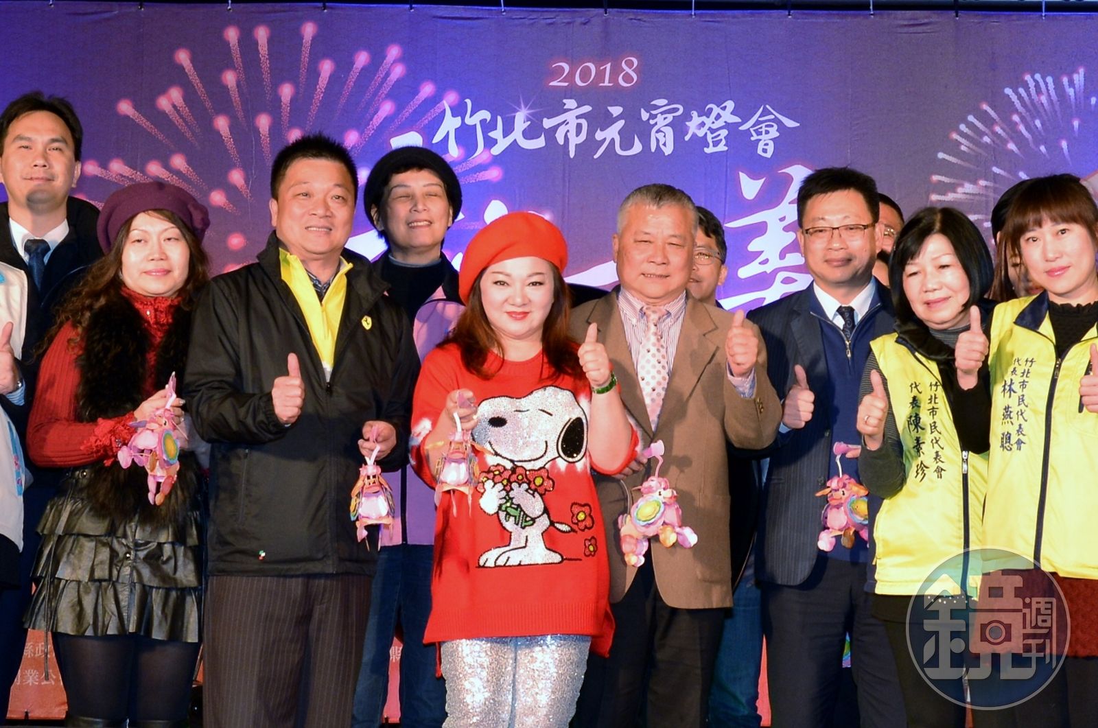 綜藝大姐白冰冰主持點燈儀式,為今年的竹北燈會系列精彩活動揭開序幕!她牽了一隻大貴賓上台,笑說:「因為台上台下都是貴賓嘛!」還笑稱自己牽的剛好是隻雪白的狗、跟自己名字最搭。