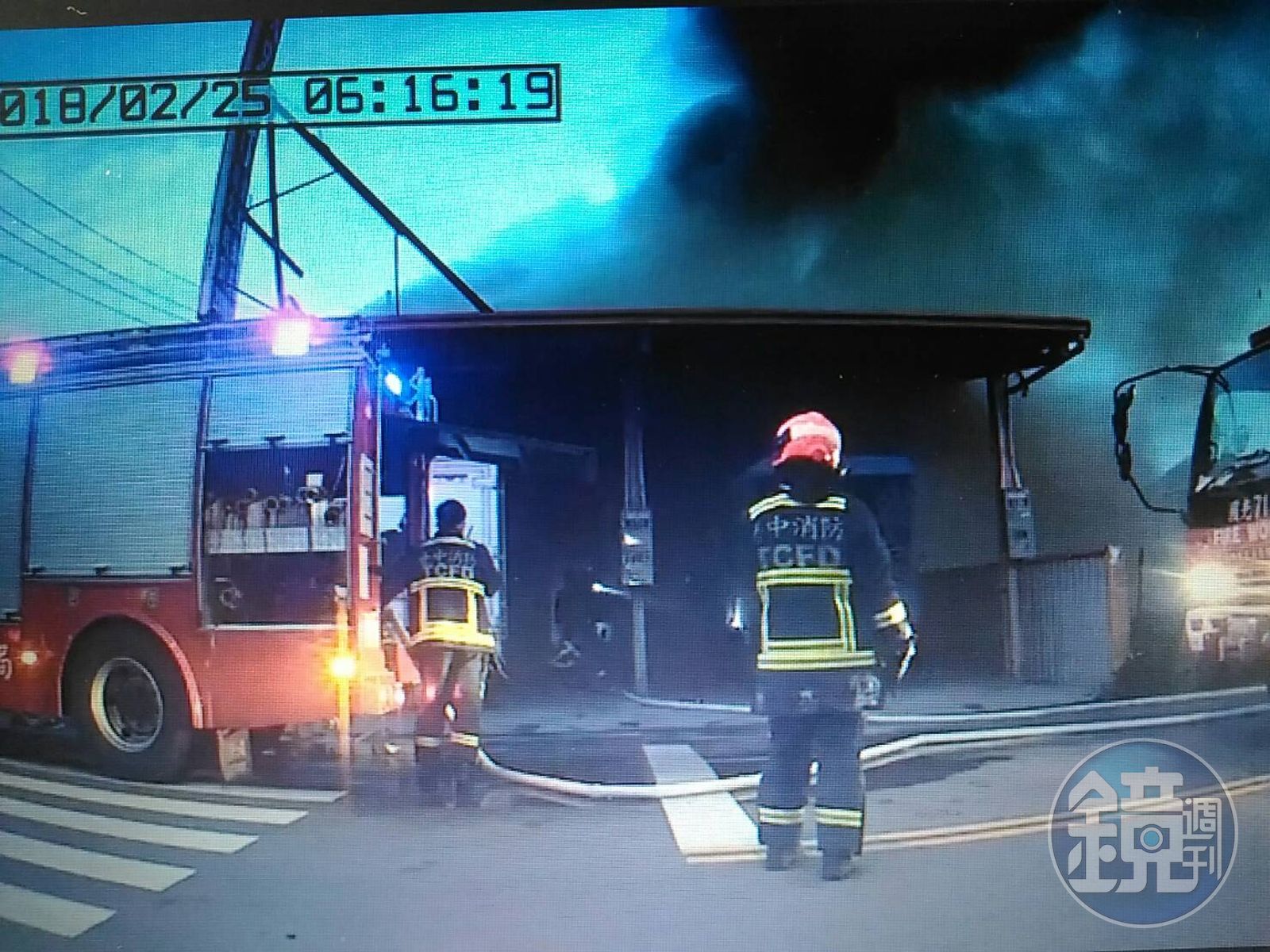 警消抵達現場,只見整棟鐵皮屋被烈焰吞噬,於是緊急佈下多條水線,強力澆灌,避免大火持續延燒,但儘管如此,火場後方的免洗餐具工廠、另一家堆放南北貨的倉庫,還是部分被燒毀。