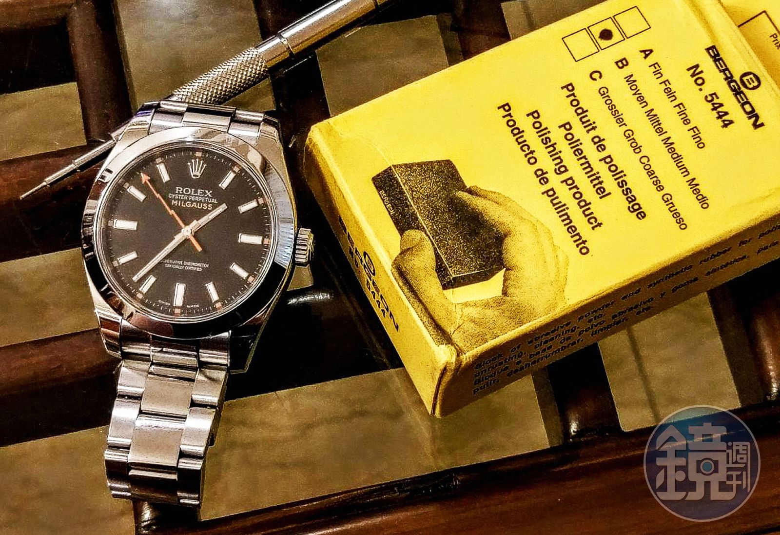 打磨磚又稱拋光磚、拋光塊或磨砂膠,是用來處理金屬髮絲紋(霧面)表面之常用工具。筆者習慣用的品牌為瑞士製BERGEON No.5444型,依細到粗分為A、B、C款,筆者通常只買A、B兩款,較深的刮痕則以菜瓜布處理;另外,日製的「除鏽去污擦」也有同樣的效果,由細到粗以細目、中目、荒目區分。筆者實際使用的經驗是BERGEON雖然價位較高、每塊接近1000元台幣,且使用時粉塵稍多,但拋出來的髮絲紋較細膩;日製品價格僅約2、3百元,且粉塵少,惟拋出來的髮絲紋不若BERGEON產品來得細。K金布又稱金屬拋光布,能夠去除金屬亮面的細紋或貴金屬表面因時間造成的氧化暗沉。筆者常用的品牌為BERGEON No.6719型,為乾式設計,拋光後不會有任何殘留物、亦毋須清洗。另推薦美製CAPE COD的產品,效果較BERGEON的顯著,惟使用後表面會殘留油脂,需以中性清潔劑清洗,對防水性較差的正裝錶或古董錶來說使用上較不便,兩者的售價皆為2、300元左右。請特別注意:CAPE COD因具潤滑油脂,為避免乾涸,可以剪刀裁切小塊後使用,剩餘的部份確實密封保存。至於BERGEON K金布則可整塊重複使用,與金屬接觸的部份會產生黑色痕跡,切勿清洗,否則洗去上頭的化學成分後便失去拋光效果。使用拉絲塊後可以風球將粉塵吹落,售價從台製品的1、200元到瑞士製BERGEON的上千元都有。德國POLYWATCH拋光膏專門針對壓克力鏡面設計,不適用於礦石或藍寶石水晶玻璃。擠取適量於超細纖維布上,以同心圓方式在壓克力鏡面上打磨,即可去除細紋、恢復光亮。每條售價約2、3百元。建議將錶頭與錶帶分離後較容易拋光整理,拆卸方式及所需工具請見「腕錶SPA & 微整不求人(上)」一文。若沒把握將錶帶整條卸下,亦可拆解尾端錶目螺絲達到相同目的。建議貼上無痕膠帶再行拆卸,防止刮傷周圍金屬部分。以ROLEX為例,新錶出廠時會在錶目螺絲尾端點上螺絲膠,若未曾拆過,需稍微使力才拆得下來。抛光磚僅可用於霧面拉絲的部份,使用前請先以透氣膠布或3M隱形膠帶遮蓋拋光部分再處理。使用順序為粗到細,盡量依照原始紋路以同方向摩擦,髮絲紋才能拋得細膩又筆直。K金布僅適用於金屬拋光部分,使用前同樣需以膠帶遮蓋拉絲部分。若腕錶防水性無虞,可用除紋效果較佳的CAPE COD油性拋光布,使用後必需以中性清潔劑清洗表面;反之,防水性稍差的腕錶則可採乾性、無殘留的BERGEON製品拋光。以手工方式打磨拋光,僅能去除細紋,較深的傷痕仍依稀可見,但至少不會有「拋過頭」的疑慮。筆者已佩戴9年的ROLEX Milgauss 116400在經過處理後,可說煥然一新。通常筆者僅處理整條錶帶及錶頭拋光亮面的部份,底蓋則盡量避免拋磨,以免中央拉絲的部份失去真圓。此外,拉絲底蓋與部分錶款之拉絲錶耳,一般手工具拋整後很難呈現如原廠般的細緻紋路,以及特定角度下折射出的獨特金屬光澤,因此若傷痕不嚴重,還是盡量別處理吧。 更新時間|2023.10.25 16:39 臺北時間