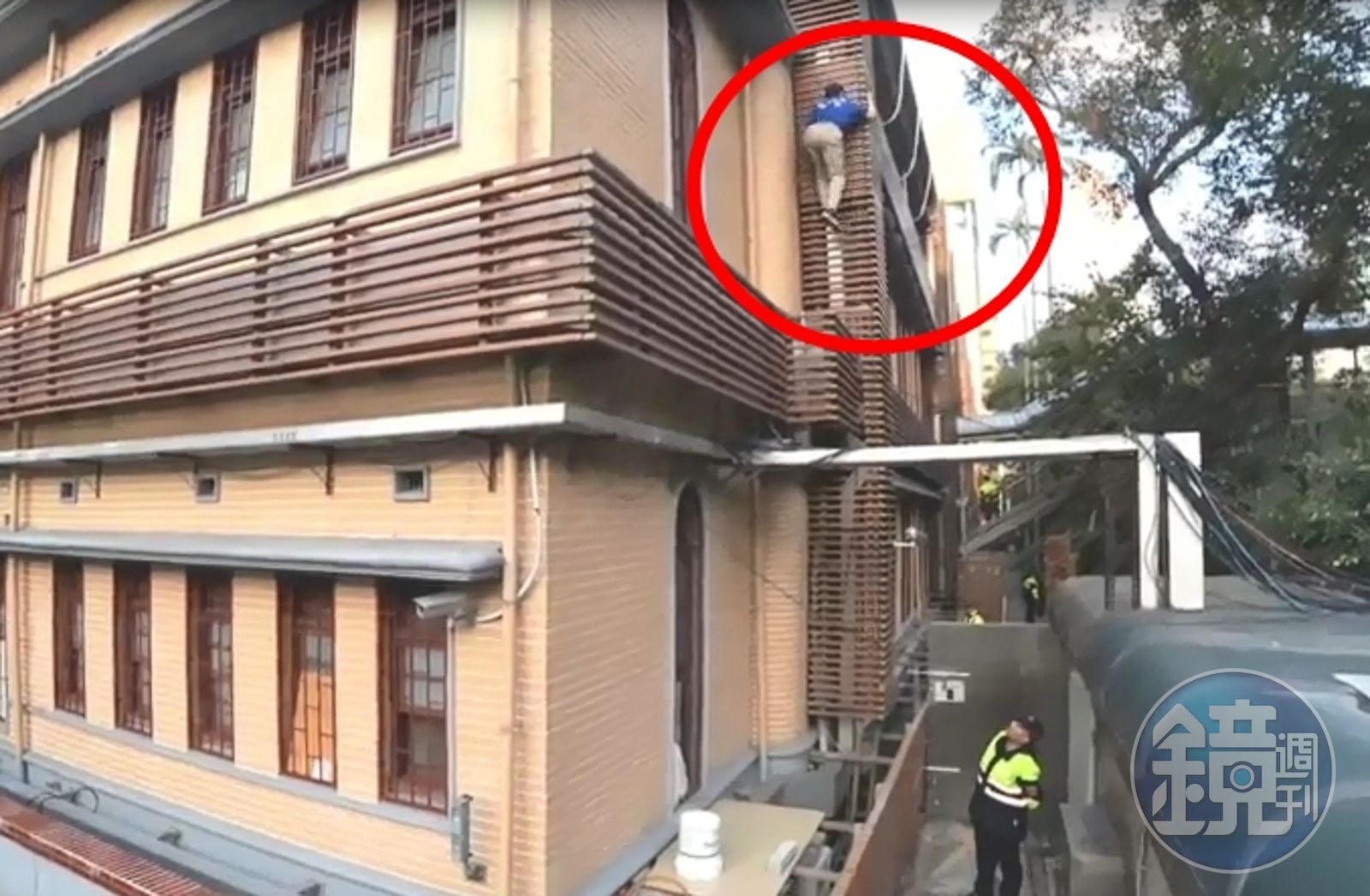 影片顯示,身穿藍衣的繆德生於立院外牆上攀爬,底下有警察不斷勸阻,在攀爬到木製建材的外牆時,建材崩壞繆德生失足後腦著地,一旁的警員也差點閃避不及,警消也立即於現場施作心肺復甦術。急救後一度傳出不治,後有搶救回來,目前生命跡象穩定。