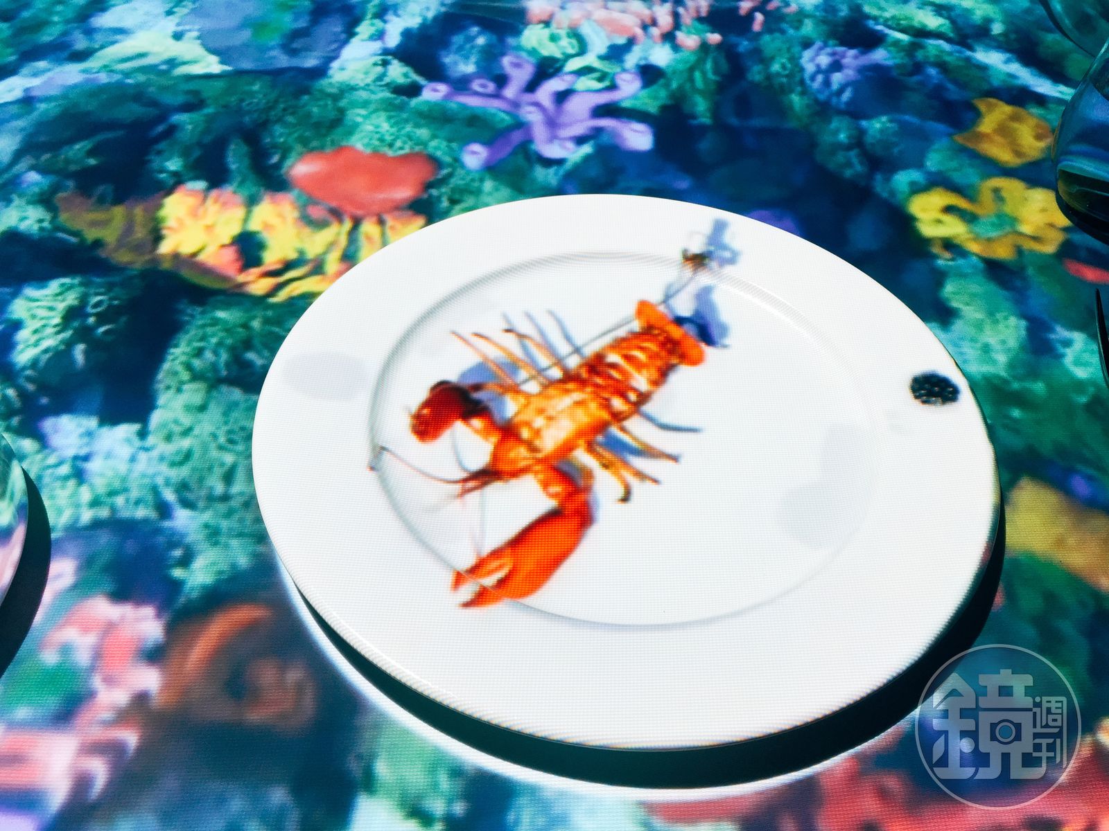 不透光的深色絨布門簾裡擺著長桌,拉上門簾,讓人有種走入密室的錯覺,座位前的底盤是塗有特殊材質的投射盤,在每一道真實的料理上桌之前,會利用天花板上的兩台投影機,將動畫影片投射在投影盤上,投影的高度、座位的間隔都必須經過反覆測試,才能呈現3D裸視的完美效果。