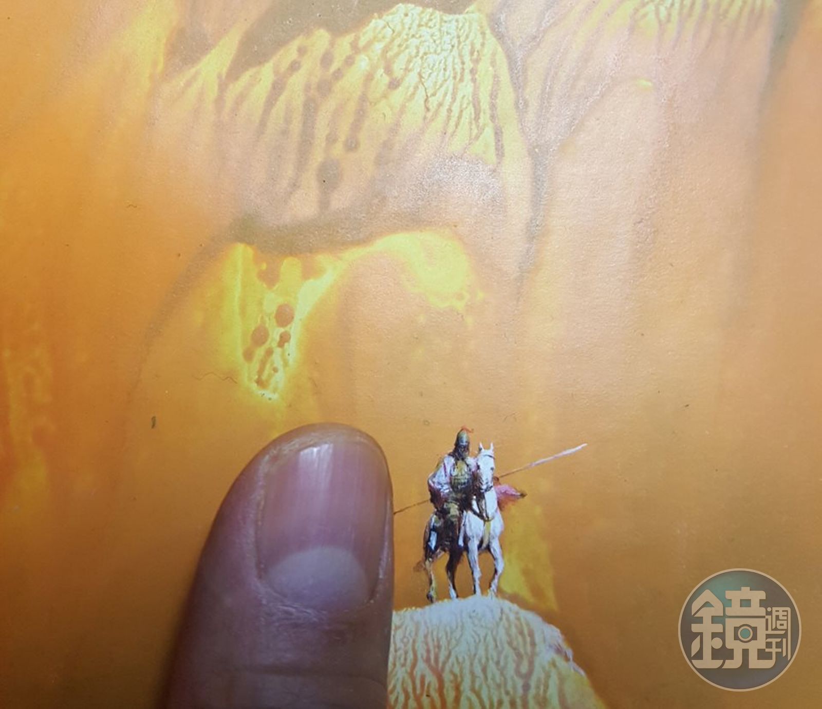 這張原稿是鄭問的名作《東周英雄傳》第三集的封底,一位騎著馬的人物竟然跟手指甲一樣「大」。鍾孟舜表示,鄭問從20歲就開始用放大鏡畫圖,可說是用「毫雕」的方式畫圖,才能有如此細膩的畫作。