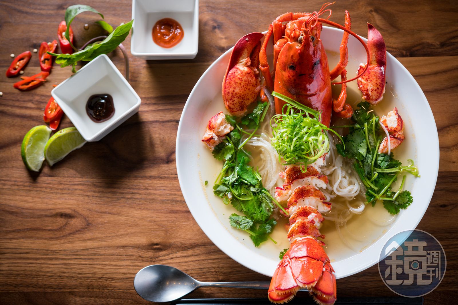 湯頭每天製作,由牛骨、牛尾和牛筋一起低溫慢燉6到8小時,龍蝦每天早上先煮七分熟,剝殼處理後急凍,出餐前,再把蝦殼與蝦頭油炸過,加進牛高湯小鍋滾,甲殼入湯,增加鮮味。再來就像拼圖一樣,在河粉上擺上首尾、身螯,華麗登場。我喝了一口,湯頭裡還有股熟悉的香料味,原來是丁香。「烤香炒熱的丁香與其他六種香料引出了湯頭最主要的層次,喝下去口裡多了回甘。」滕有正說。附上一盤豆芽、九層塔、生辣椒、檸檬,加進湯裡甘醇立刻轉為鮮猛,教人出汗。