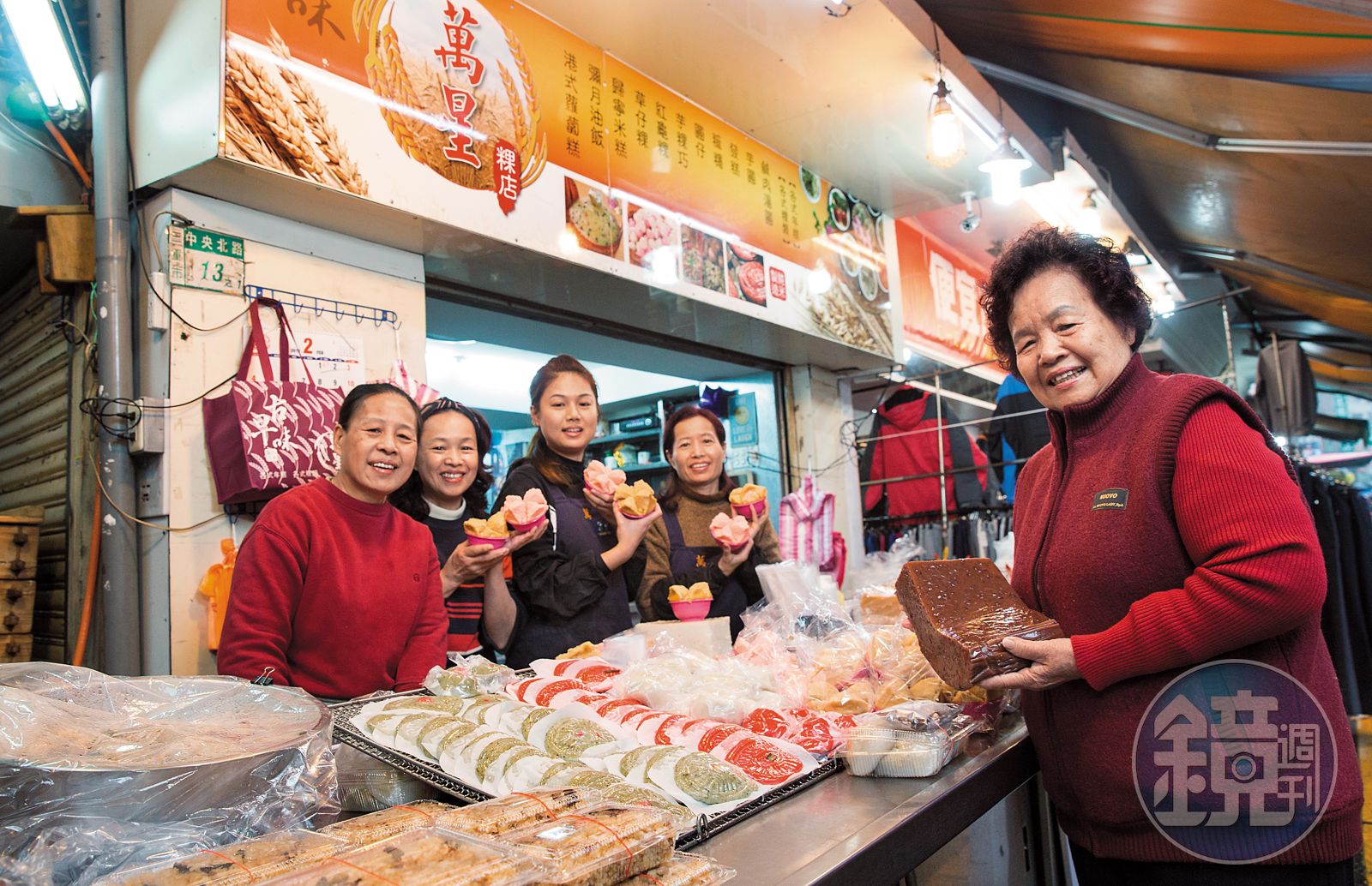 清晨5點多,三重中央市場早已人聲鼎沸,頂著不到十度的低溫,萬星粿店的二女兒簡美玉,陸續將早上蒸好的年糕、紅龜粿、草仔粿擺上攤位。