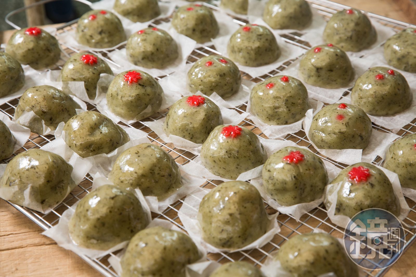 抓起一把艾草,楊松桂說,由於草仔粿使用的艾草部位只有葉子,因此使用天然艾草製作的艾草粿,表面必然留有葉子的纖維,「像這個一點一點的就是葉子的纖維,因為機器怎麼打都沒辦法完全攪碎,所以你去外面看,整顆綠綠的草仔粿絕對是用色素、都是作假的,色素跟天然的吃起來口感也不一樣。」