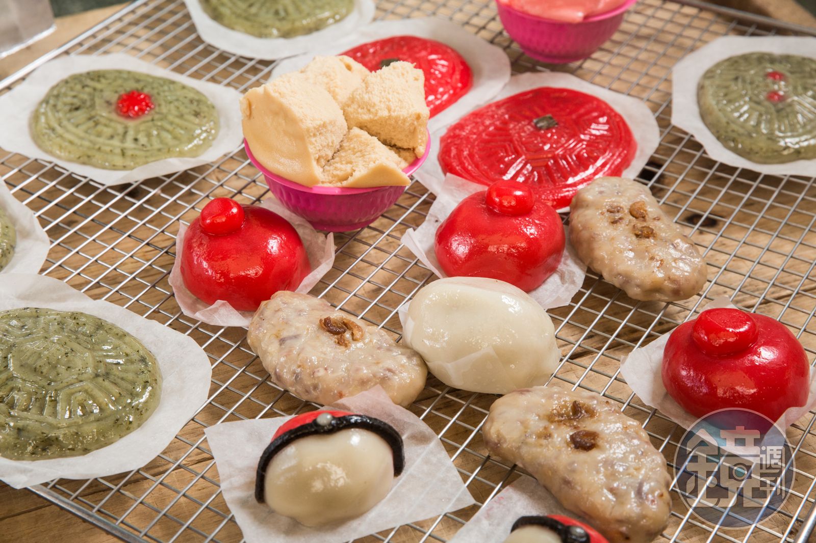 簡滿足說:「一般農曆過年,傳統都會吃年糕和發糕,象徵步步高升、新年發財,等到大年初九天公生日,則會祭拜紅龜粿祈求福祿壽,還有紅圓祈求闔家團圓,以及造型類似古代錢幣的乾圓,用意是要鎖住錢幣,不讓錢外流。」