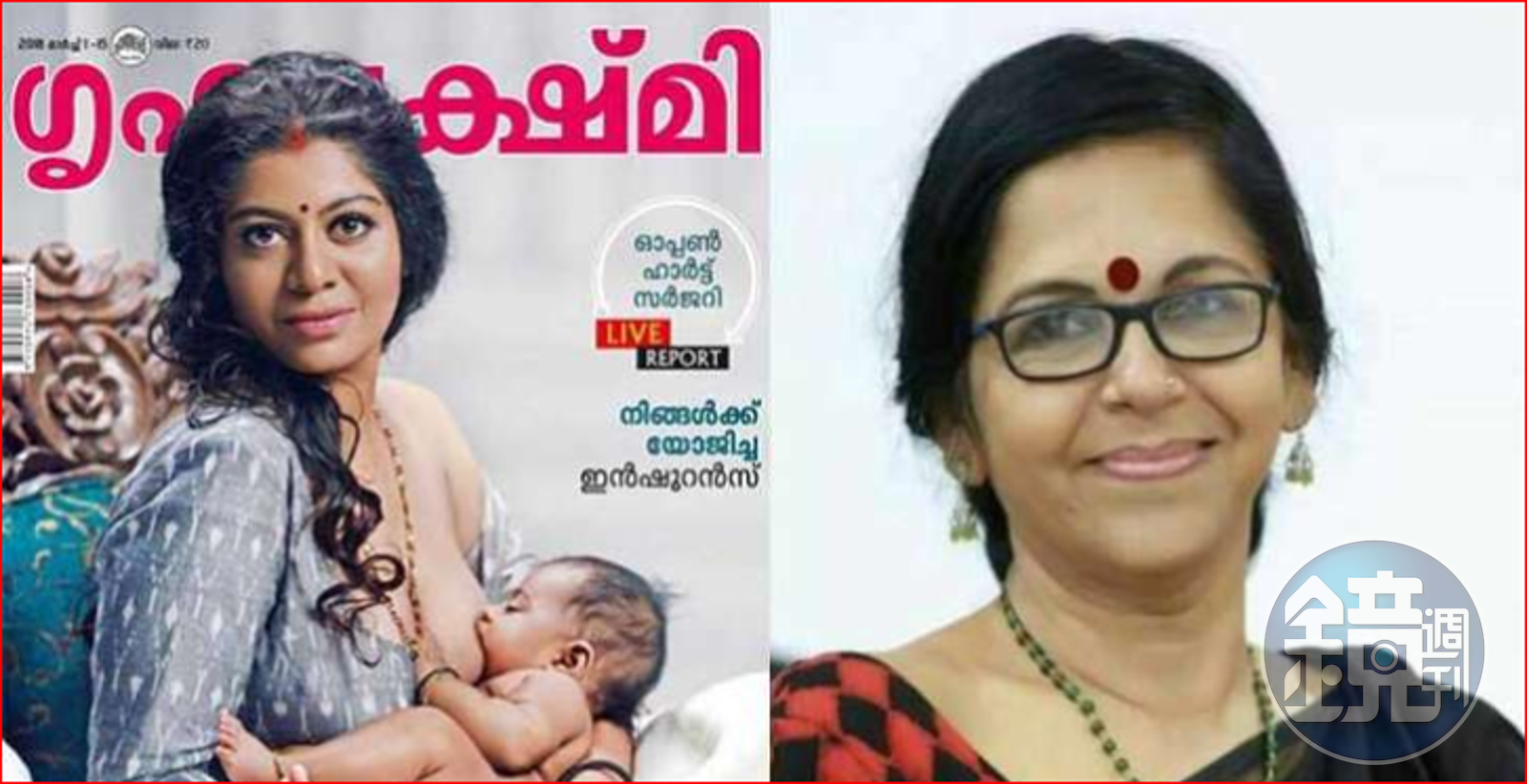印度喀拉拉邦地方性雜誌Grihalakshmi的3月號封面上,請到身兼藝人和詩人的女模Gilu Joseph,以胸部半露的方式呈現媽媽給小嬰兒餵乳的畫面,搭配文字標題:「為人母者呼籲喀拉拉──別再無禮盯視,我們是在哺乳」,用直接露骨的方式,挑戰印度社會禁忌。