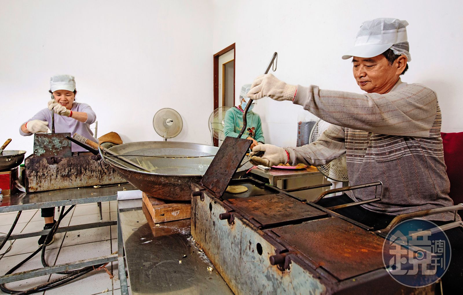 熟能生巧後,兄妹倆也在口感上有所改良,包括增加蛋汁比例讓煎餅更酥脆,找專業代工廠訂製特殊尺寸與不規則剖面花生顆粒,增量並均勻拌入粉漿,整片煎餅密密麻麻散布花生粒。楊仁彬說:「既然要做就要做好吃一點,否則送人人家也不想吃。」近年也新增芝麻口味,唯獨在造型上,仍維持祖父時代傳承下來的扇形瓦片。