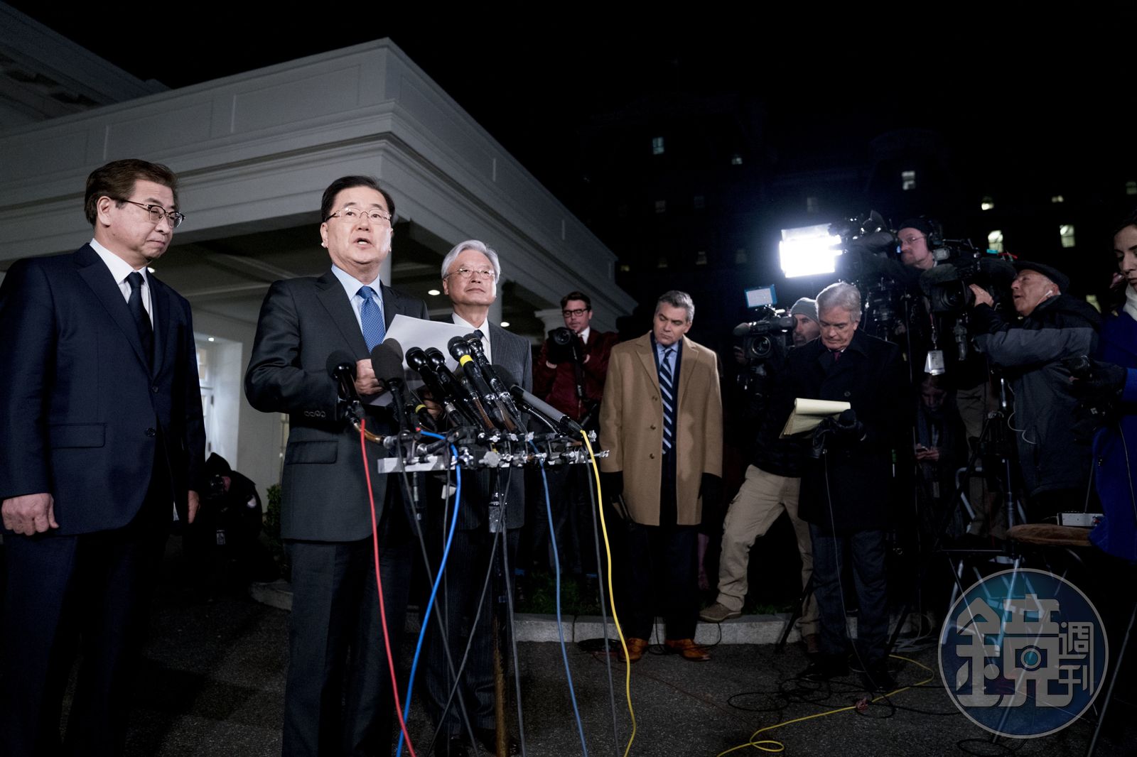 赴美的南韓特使團的代表鄭義溶表示,他們轉交了一封金正恩的信件給川普。除了邀請川普和金正恩會面。他們說金正恩也同意暫停核試爆與導彈試射並將「致力非核化」。