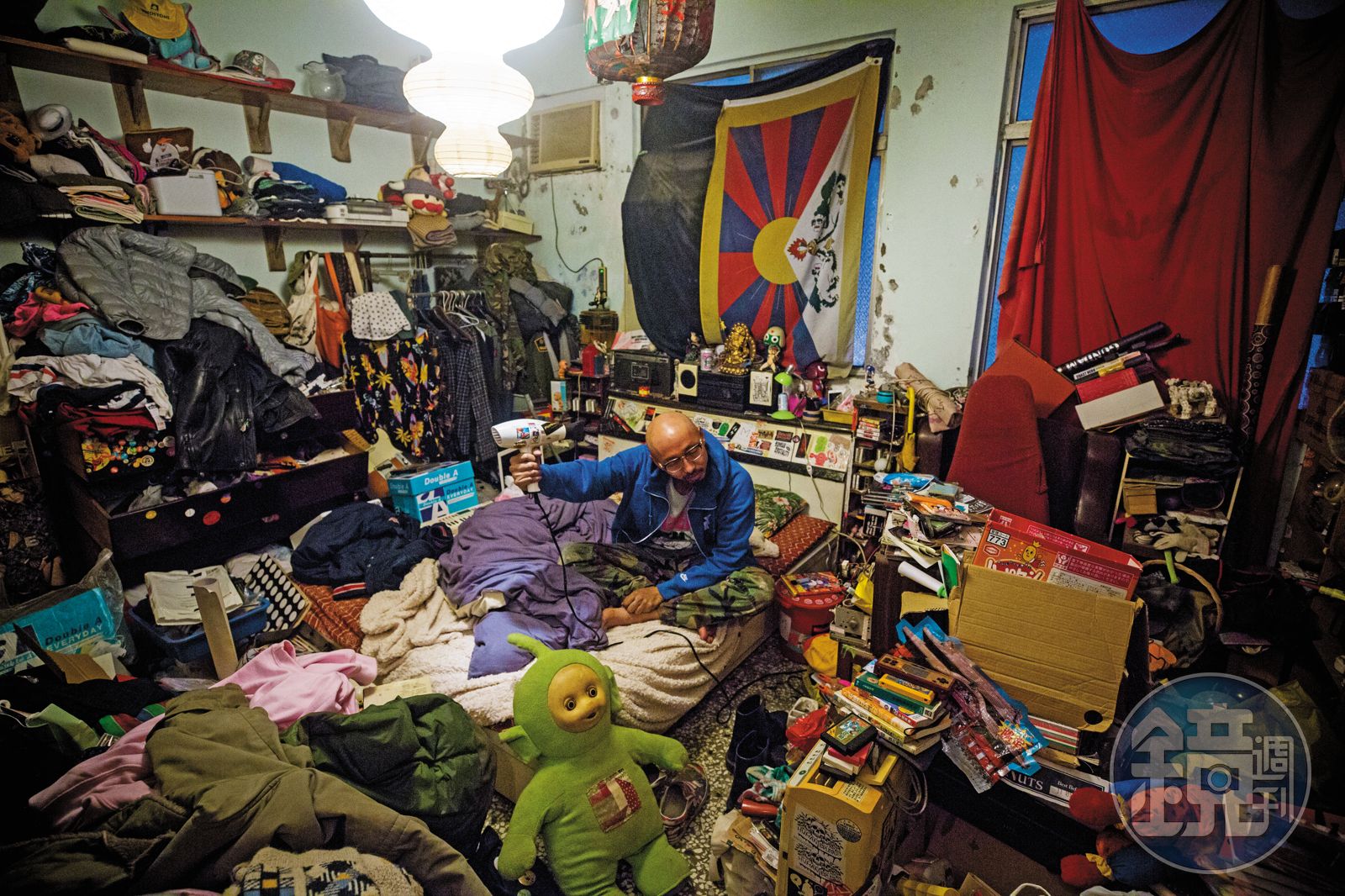 房子裡全堆滿了不知哪收集來的車牌、小佛像、各式各樣的絨毛玩偶、公仔、水電材料…甚至一整套爵士鼓。滯悶的空氣摻雜著霉味,與啤酒過夜後的發酵味,與人等高的雜物像棄置的巨神像,有種放棄一切的姿態。約莫25坪大的房子,扣除房間廁所,只能找出沙發一角讓2人並肩坐下。「其實這些東西造成很多麻煩,走路時都要跨過去,膝蓋都出問題了。」麻利喝了口啤酒靦腆地笑著。