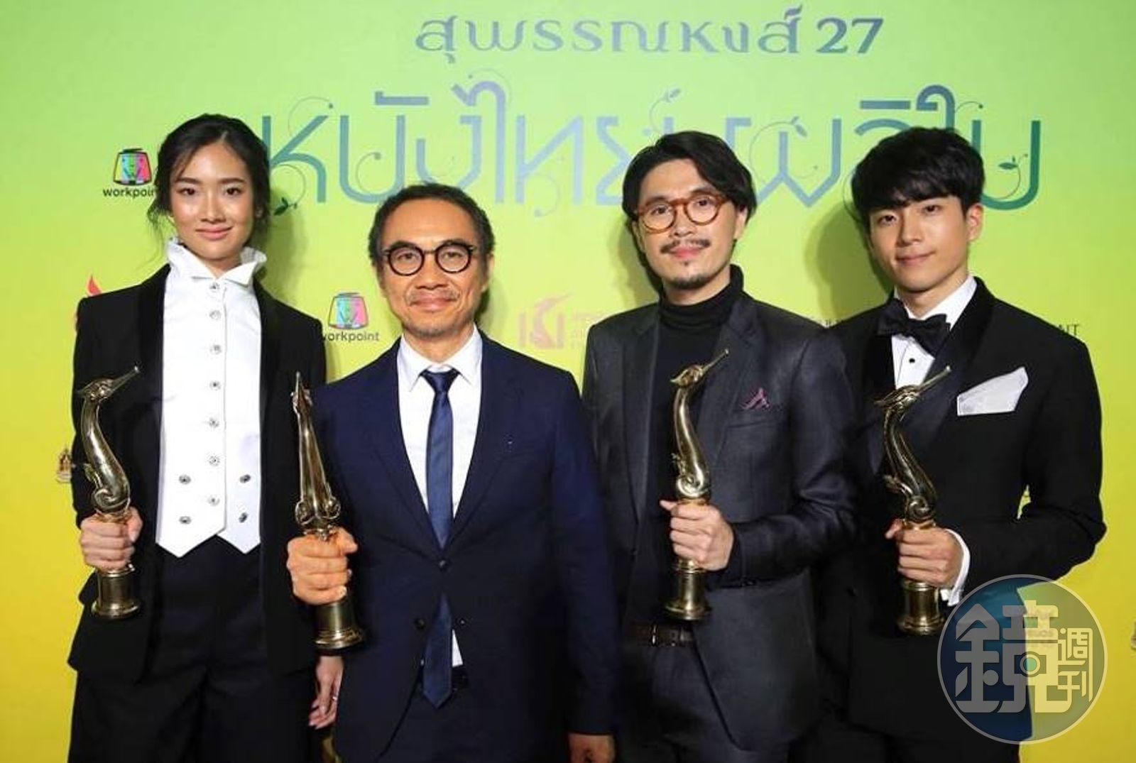 拿獎的Aokbab(左起)、最佳男配角得主Thaneth Warakulnukroh、導演Baz及Nonkul一起合影。(GDH臉書)發布時間:2018.03.12 15:18 臺北時間