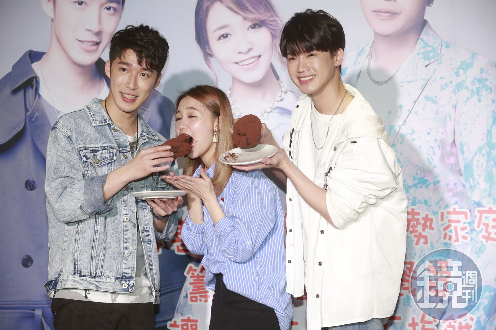 南拳媽媽成員洪言翔(右起)、陳羽緁、曹景豪大吃沾滿巧克力粉的「髒髒包」,為了公益不計形象。發布時間:2018.03.13 17:08 臺北時間