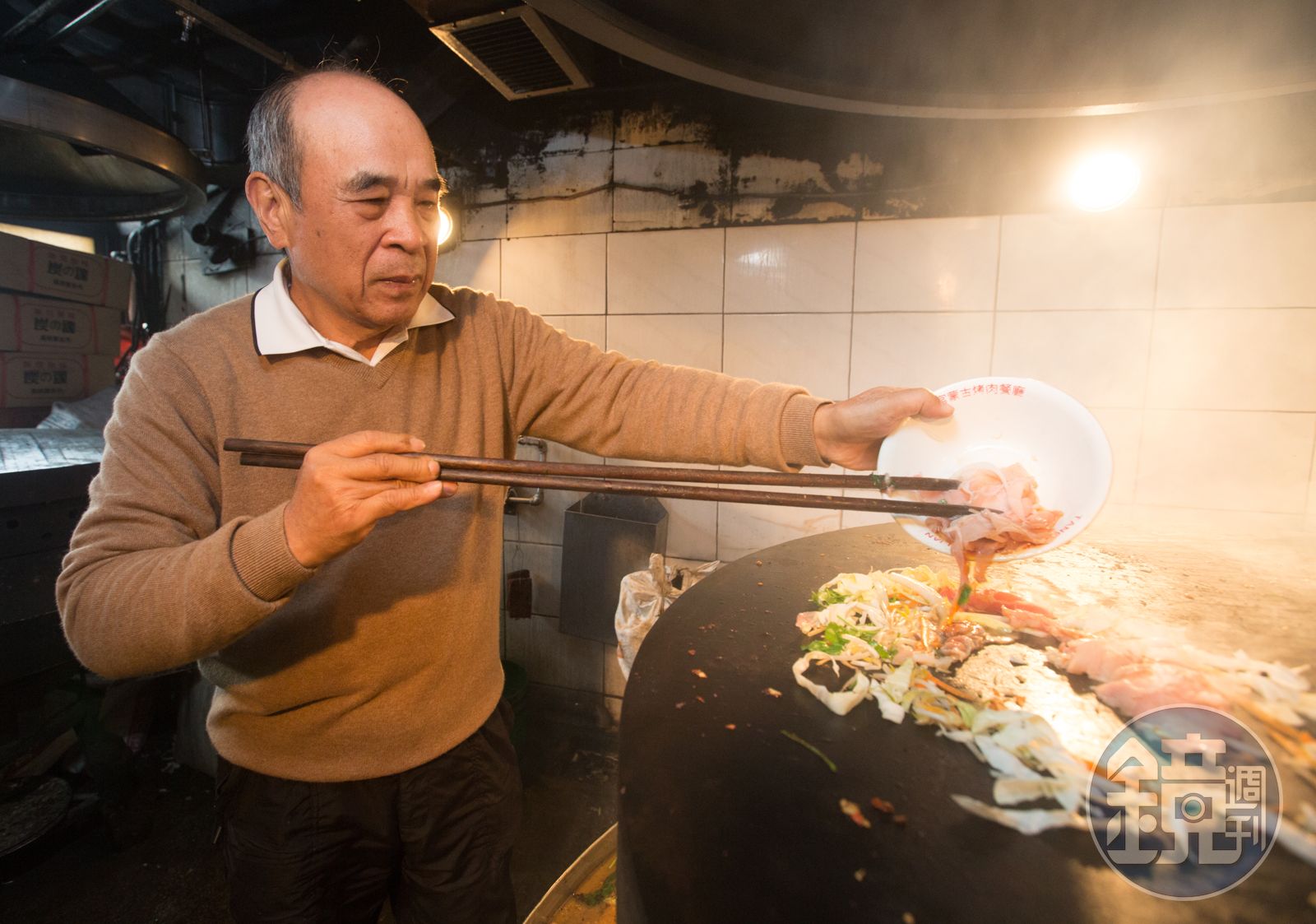平時,陳詠富是不進烤肉烹調區的。但臨到假日,見排隊等烤肉的客人愈來愈多,總是把「客人是衣食父母」掛在嘴上的他,忍不住還是捲起袖子、拿起長筷,站到溫度350度的鐵鑄大爐旁,幫忙揮筷消化一碗碗的「肉山」。