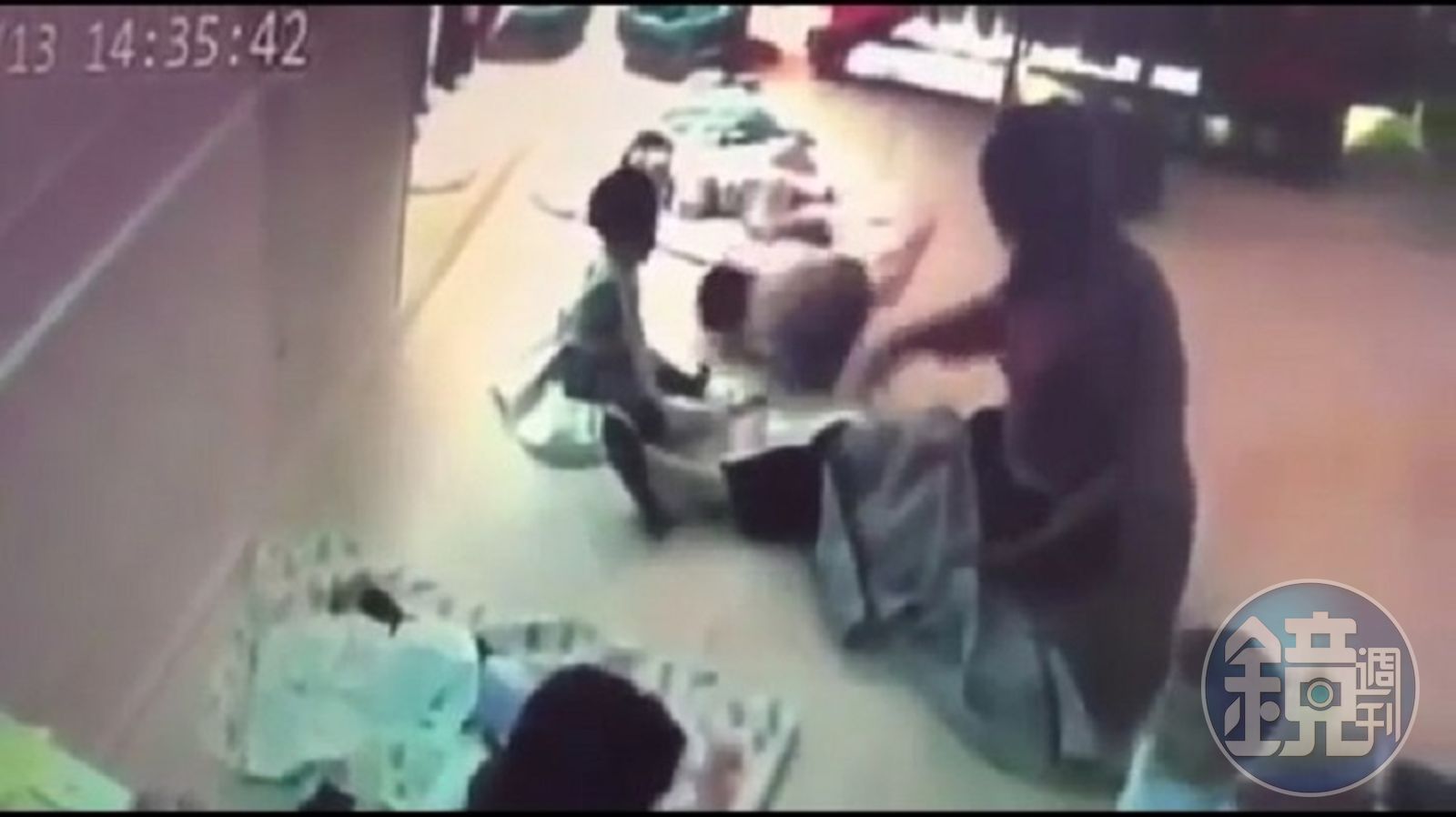 監視器畫面顯示,一名保母正坐在地板上整理衣物,數名幼童在睡覺,還有兩名小孩坐在地板上,其中一名幼兒疑似吵鬧,保母竟惡狠狠地出手拍打幼童頭部,使得幼兒重心不穩倒地,保母隨即拿起地板上的毛巾,再次毆打幼童頭部,接著再出手將幼童推倒,致其頭部撞到地面。