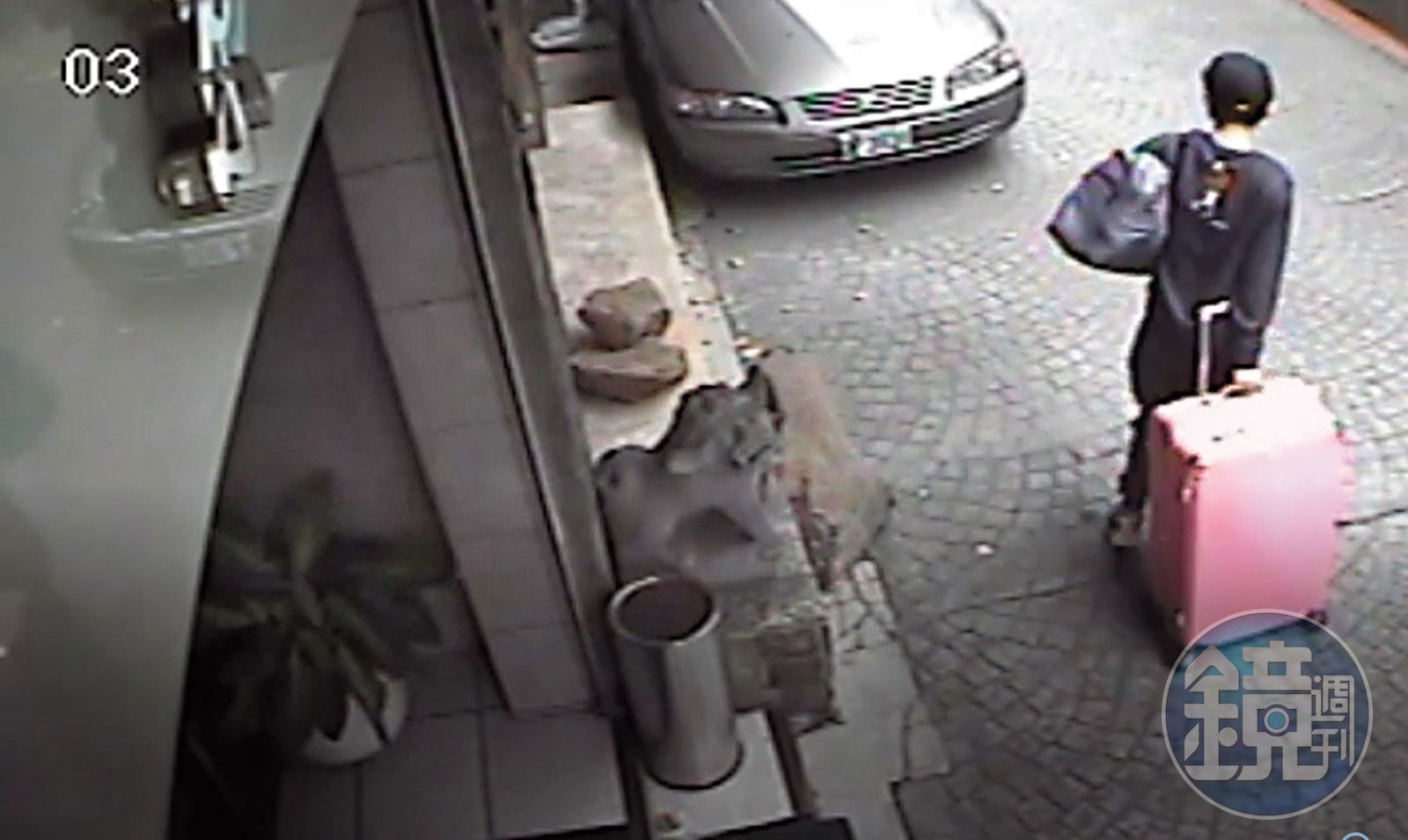 陳男獨自一人離開旅店,潘女的屍體已被放置粉紅色行李箱內。(翻攝畫面)發布時間:2018.03.19 06:59 臺北時間