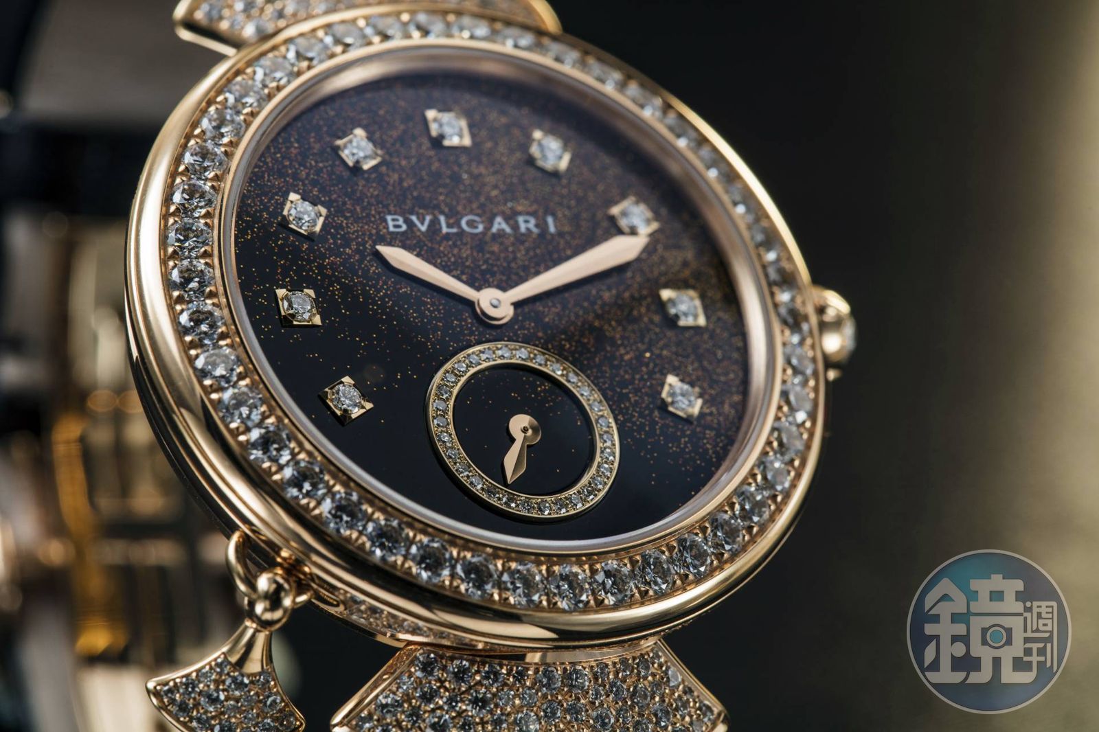 另外一方面,單單從珠寶錶的外型來看,寶格麗此錶也叫人讚嘆。手錶外型來自於Diva系列珠寶,其有如扇子或裙擺的造型,來自於古羅馬大浴場「卡拉卡拉浴場」(Baths of Caracalla),雄偉的馬賽克拱頂柱廊所構成的特殊線條。將之設計成珠寶錶款,擁有非常容易辨識的視覺特色。面盤則採用日本的蒔繪漆藝製作,以真漆與金粉層層堆疊,色澤與玫瑰金鑲鑽錶殼的搭配真是天作之合。