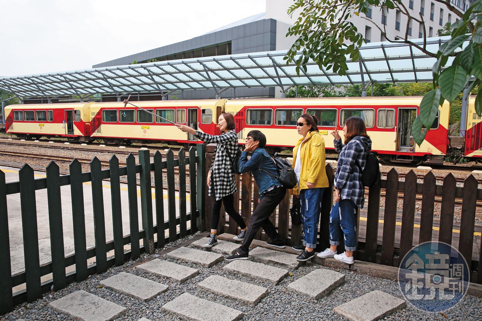 阿里山森林鐵路本線停駛3個月檢修,嘉義北門車站外的遊客只能自拍乾過癮。發布時間:2018.03.21 04:59 臺北時間