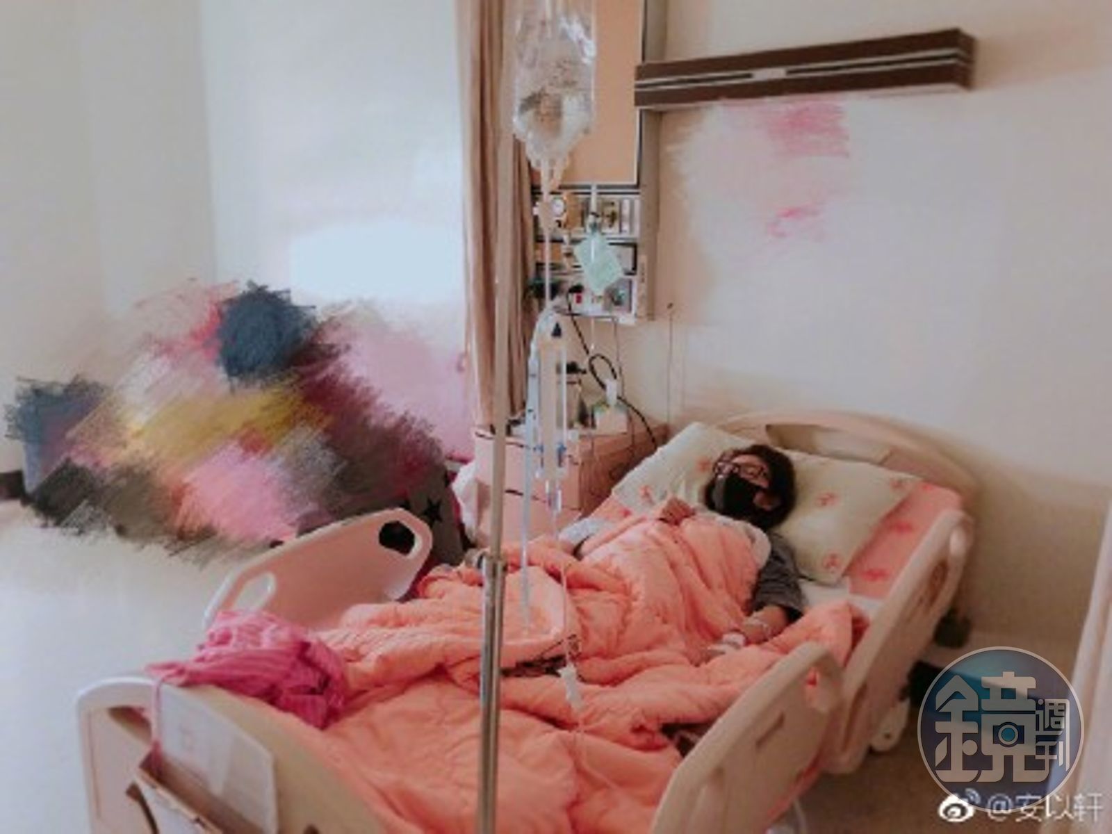 安以軒今年過年和情人節,都PO出和老公甜蜜幸福照,羡煞一票朋友,但今天下午她卻毫無預警地在微博PO出2張照片,一張打著點滴,另一張則是戴著口罩,極為虛弱地躺在病床上的照片,然後她寫下:「人生總是有很多的意外~有些是驚喜,但~有些是『驚嚇』。因為醫生大人說這個突發的狀況需緊急優先處理否則會有生命危險。所以必須做一個……嗯……『小手術』……(這樣寫大家有沒有比較放心一點?)。還好一切順利,休息幾天後我可以正常生活,但需要靜養觀察一段時間。」