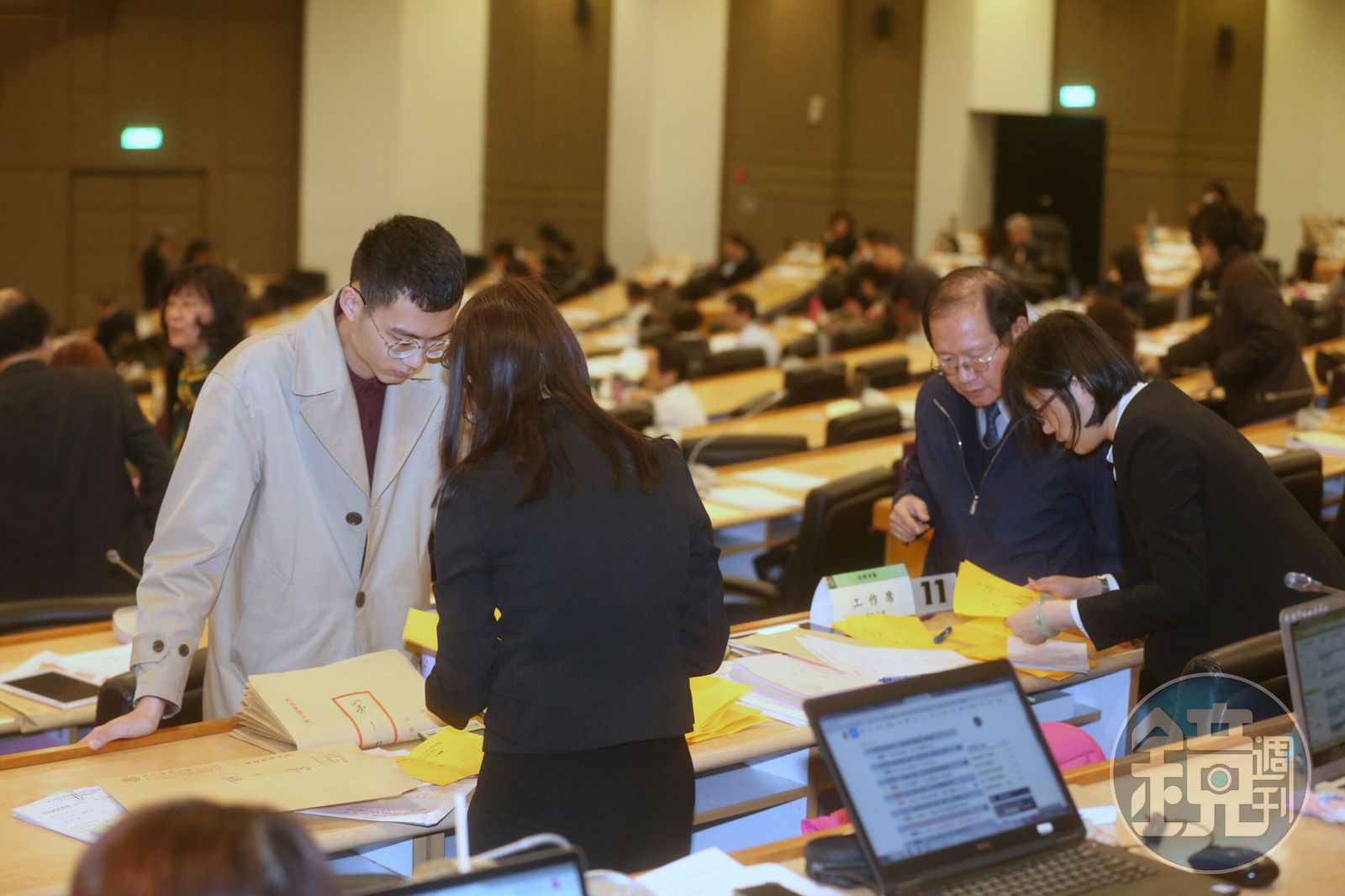 台大行政人員已經準備好一大疊的選票,上頭都寫著「贊成」與「反對」兩個選項。今天會議一召開後,學生代表就多次針對臨時校務會議開會時間提出質疑,緊接著又有校務代表提出「候選人與校長遴選委員應該迴避」提出質疑。