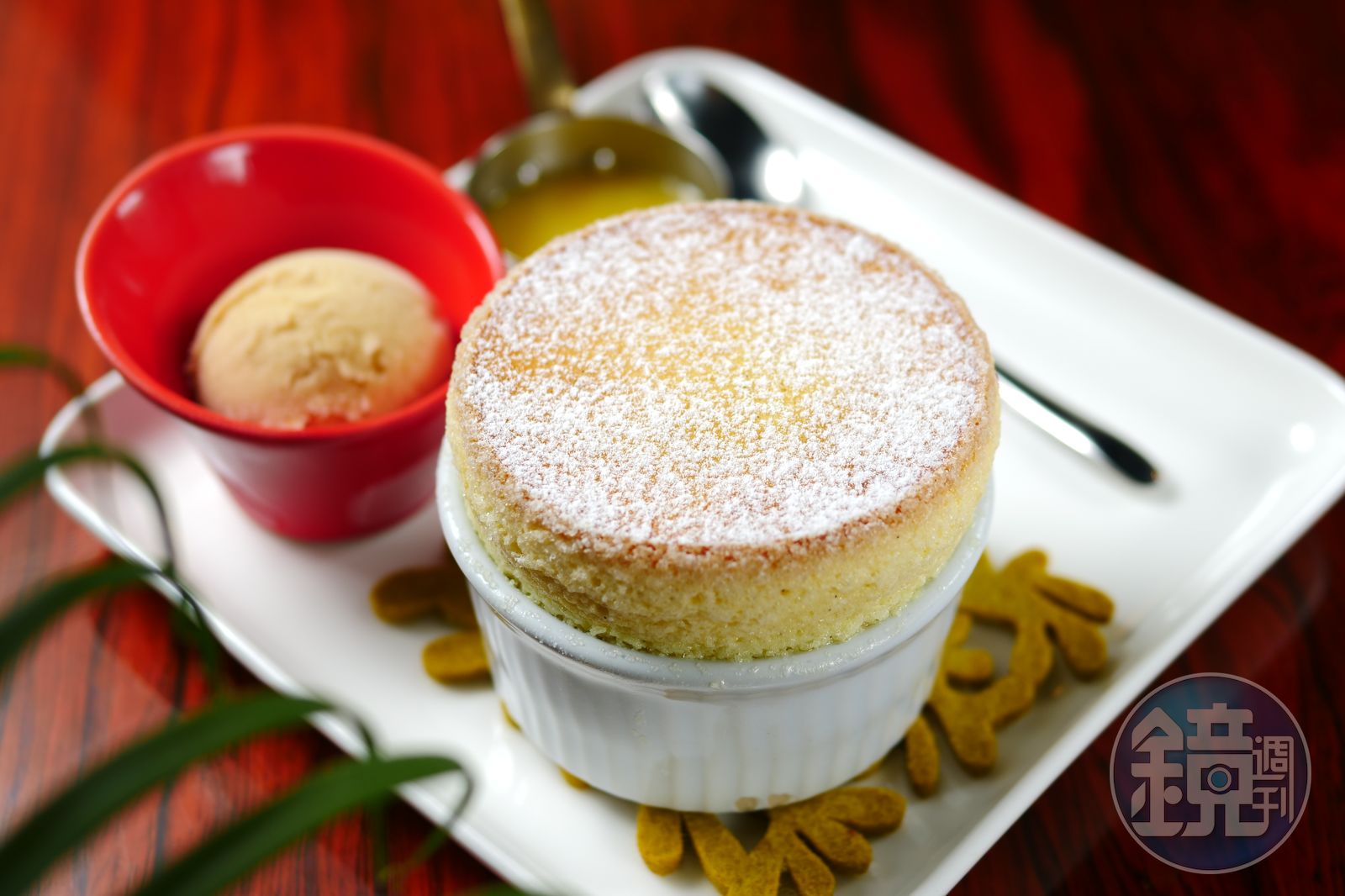 舒芙蕾是稍縱即逝的甜點,要吃得等半小時,上桌卻只剩3分鐘。「最重要的是蛋白,如何攪拌到合適的狀態,口感可以輕柔,又能膨脹得很美。」李家銘說。除了原味,每天限定推出的茶舒芙蕾則是將新鮮茶葉磨粉,加入卡士達中。剛出爐的舒芙蕾表面帶點焦脆,裡層卻如棉花糖一般化口。你可吃原味,也可舀一勺附上的自製桂花釀或焦糖海鹽糖漿,李家銘有自信的說,那是多給的,即使不加,也不減美味。