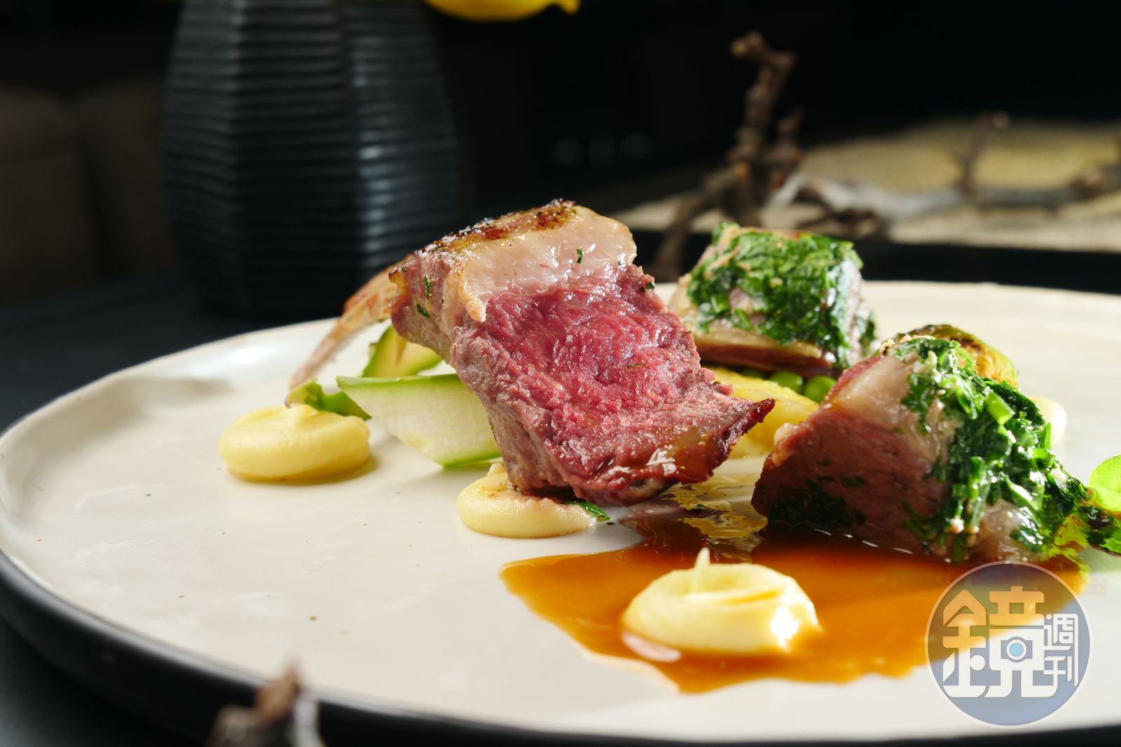 好比「豆腐乳烤羊排」參考台式羊肉爐的概念,以苗栗豆腐乳醃漬羊排2天舒肥後再烤,肉汁與豆腐乳加上紅酒製成醬汁;另一道「咖哩和牛臉頰肉配荷葉包飯」則效法廣式糯米雞,選用池上林龍山冠軍米做成葡式咖哩風味。早已跳脫法餐的形式,但那醇厚的滋味依然可見資深名廚的底蘊。