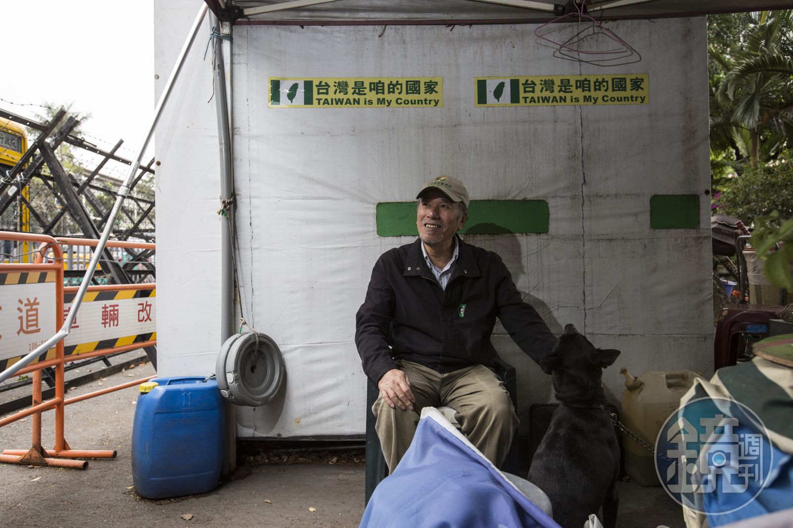 大半生為日子拚搏的他直到2008年的陳林會,才第一次上街頭:「我第一次遇到警察,腳還會抖,會怕。」書生走上街頭,街頭知識也來自於書:「我不知道怎麼抗議,就讀書。」同年,他主張公投法補正在立院門口搭棚絕食,最後體力不支被送醫:「很多人說,算了啦,可以退場了。怎麼可以這樣?你們走,我不走…。」就這樣原地紮營過了10年。