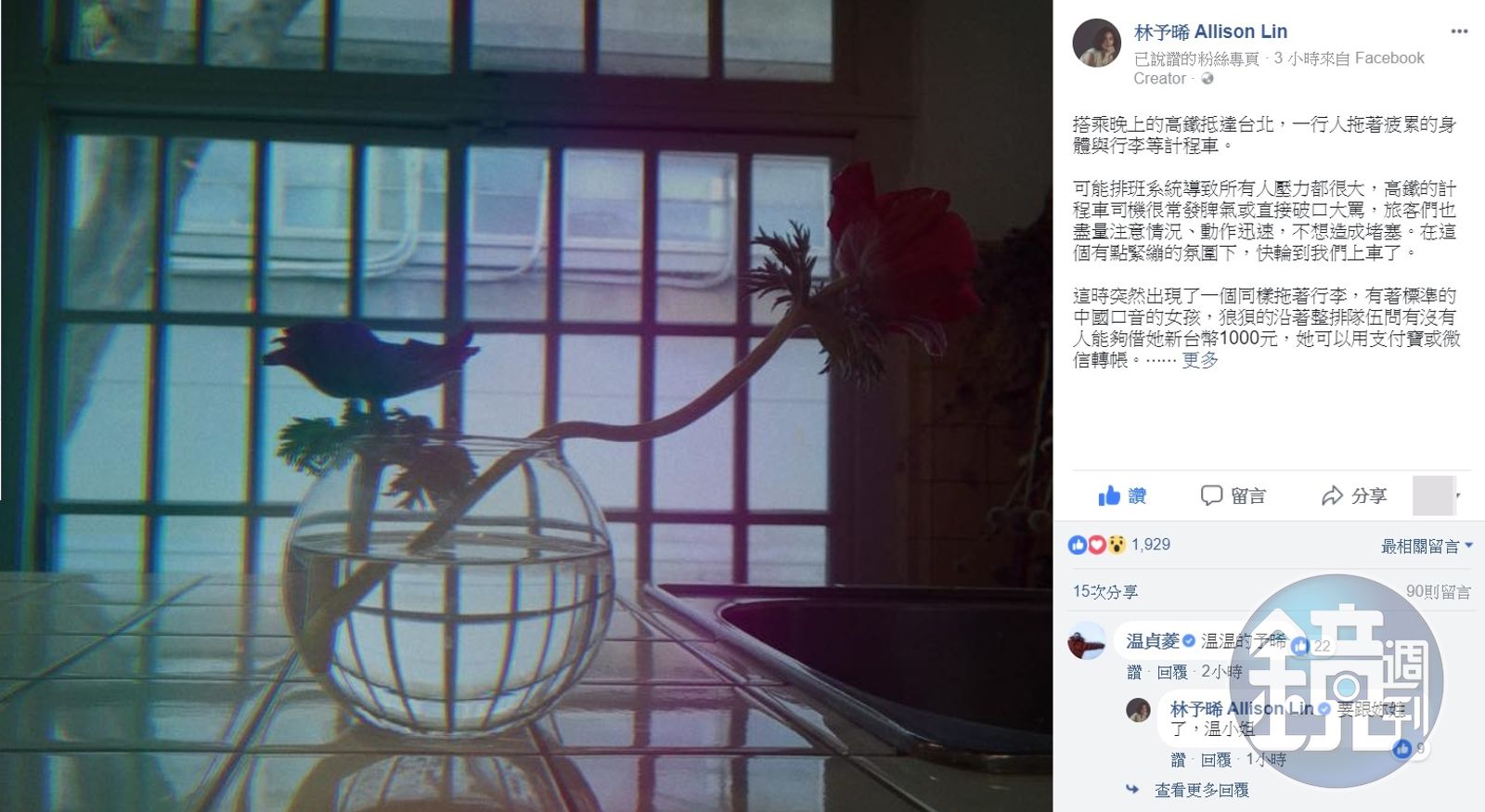 林予晞和同行夥伴一開始也向女孩搖頭,直到看到連隊伍最後一個男孩也不願意借錢,女孩焦急的模樣打動林予晞,她向林予晞解釋,她的飛機就快要飛走了,擔心搭捷運來不及,想用現金搭計程車,她可以透過微信和支付寶還錢轉帳。