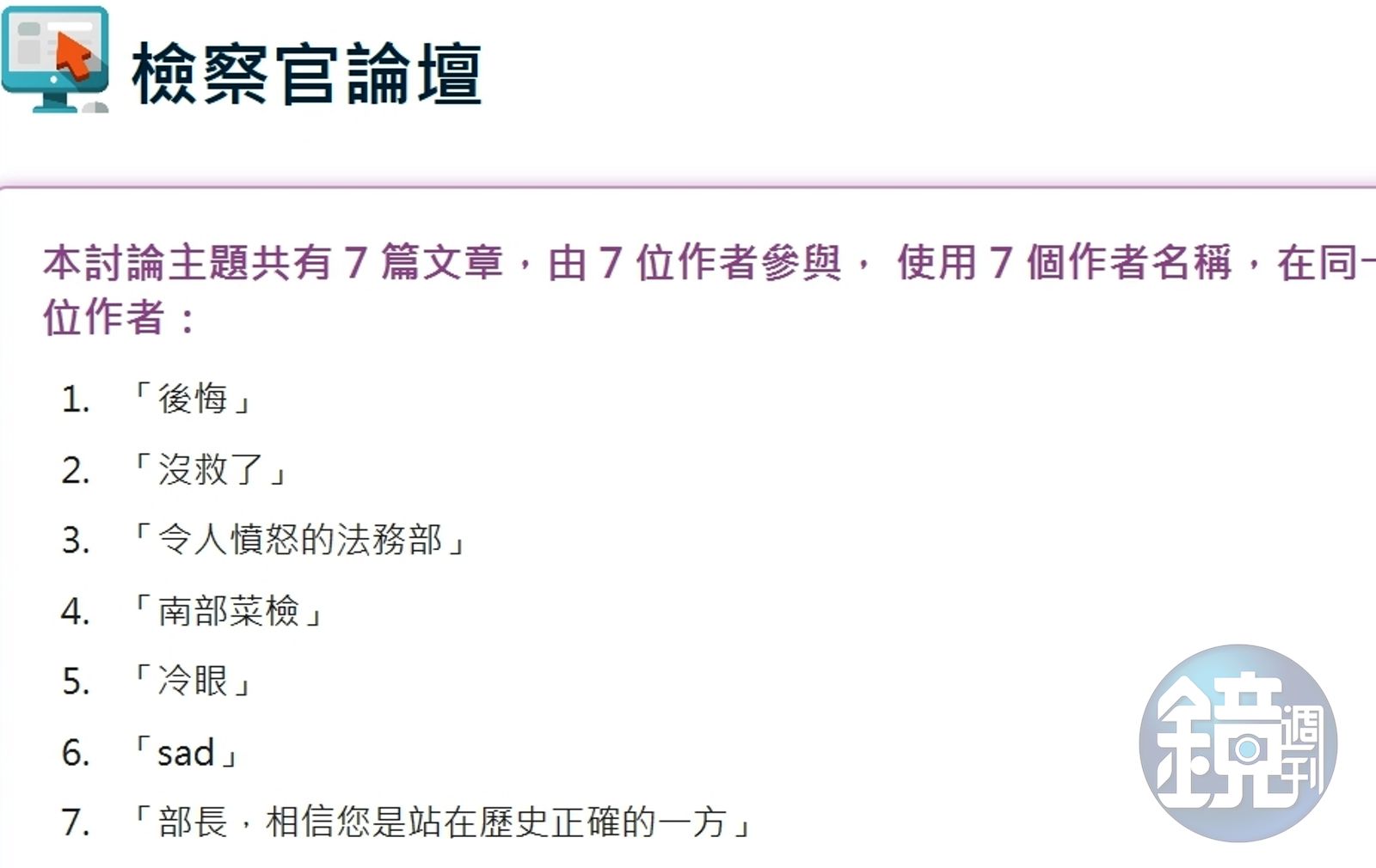 針對檢察人事改革,檢察官論壇上這2天出現標題為「萬年二審真是勢力龐大,朝中有人罩果然是不一樣 」「都已經鞏固了萬年二審,你竟然還想往後延?」「如果這個改革推不動,我們還能有什麼力量做其他改變?」的熱烈討論。