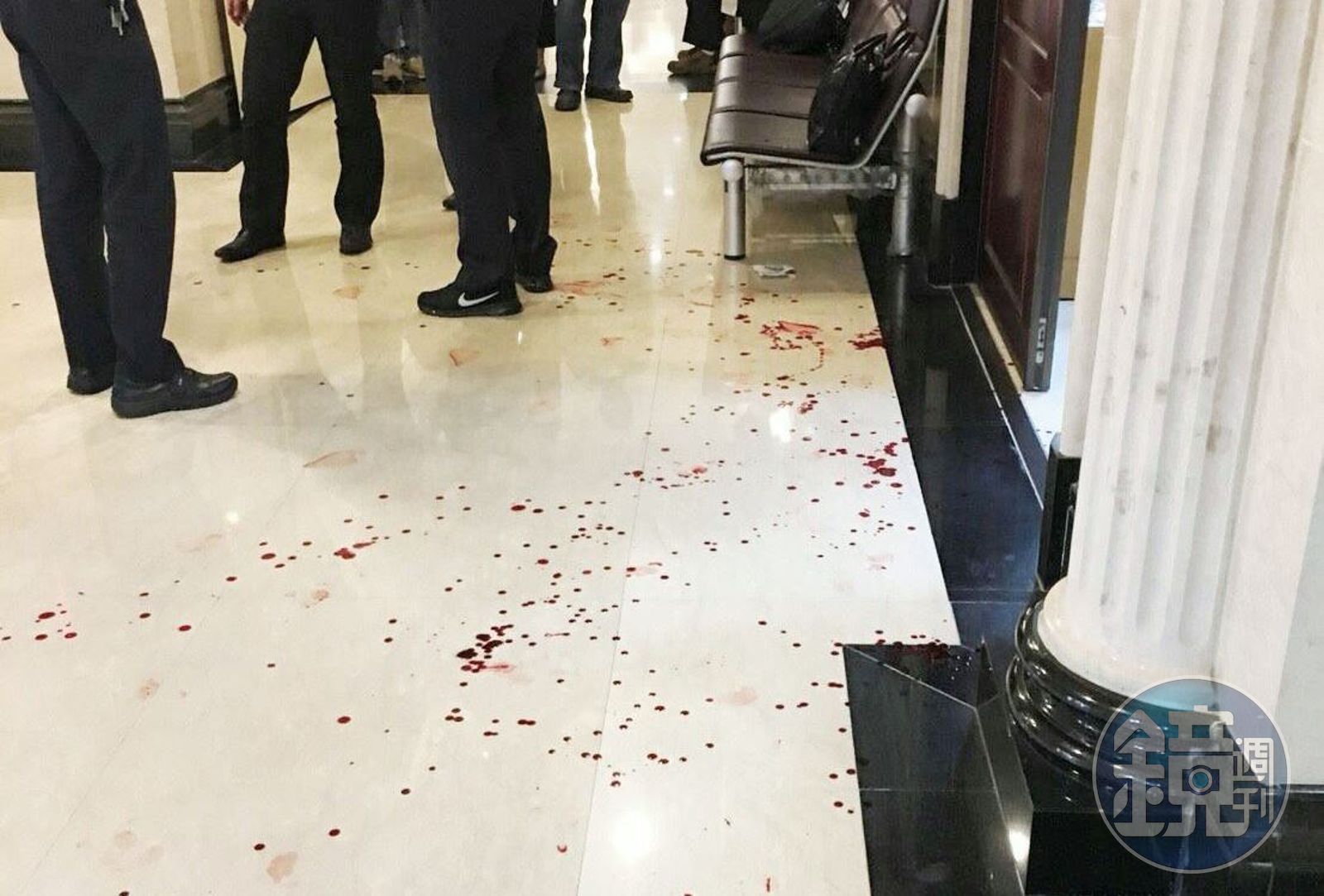 傷者手部有12公分的撕裂傷,現場血跡四濺、怵目驚心,一旁等待出庭人士均嚇得不知所措。