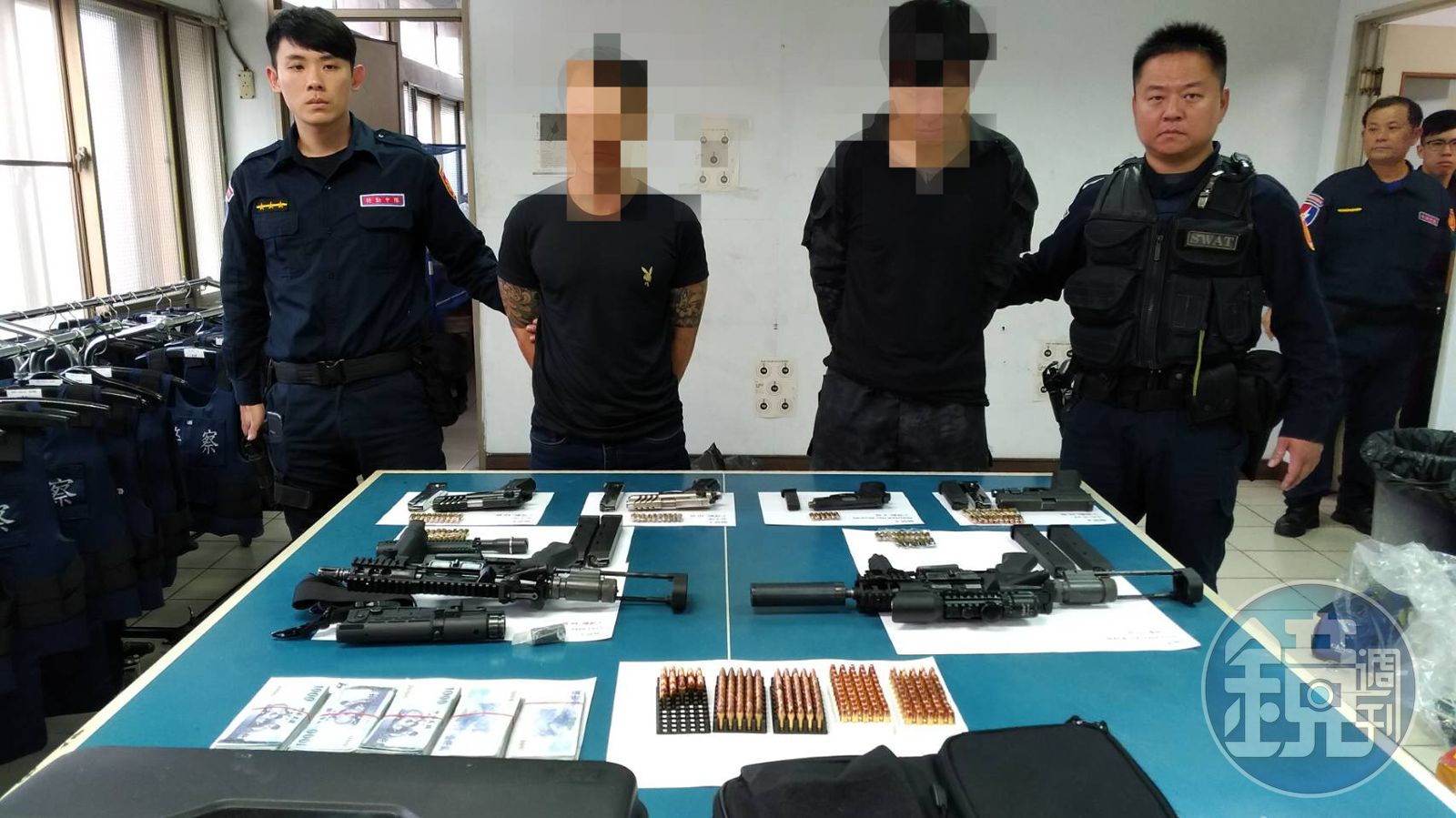 警方控制現場後,逮捕另2名嫌犯陳羿丞、洪億原,並查獲COLT RM22401衝鋒槍2把、改造手槍克拉克17、改造手槍MAUSER HSc Mod.90各1把、改造手槍仿金牛座2把、子彈共305發和手榴彈1枚,其中有97發子彈是達姆彈,火力相當強大。