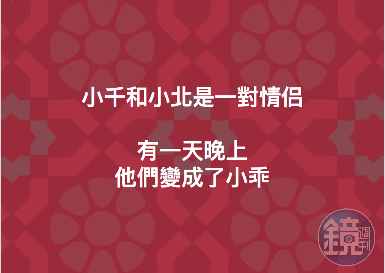 這張讓大家想入非非的字卡就是「小千和小北市一對情侶,有一天晚上他們變成了小乖」,讓不少網友看完直呼「叫警察喔」「司機大哥我要下車」「以後乖是暗號」,但也有網友反倒認為很純愛,「就是小北很累,小千背著她,從後面看就成了小乖。」此外,也有人kuso改編成凶殺故事:「小北被肢解後小千一手拖一半」,或是自行聯想番外篇:「第二晚,小北說換我在上面,變成了小㘳」。