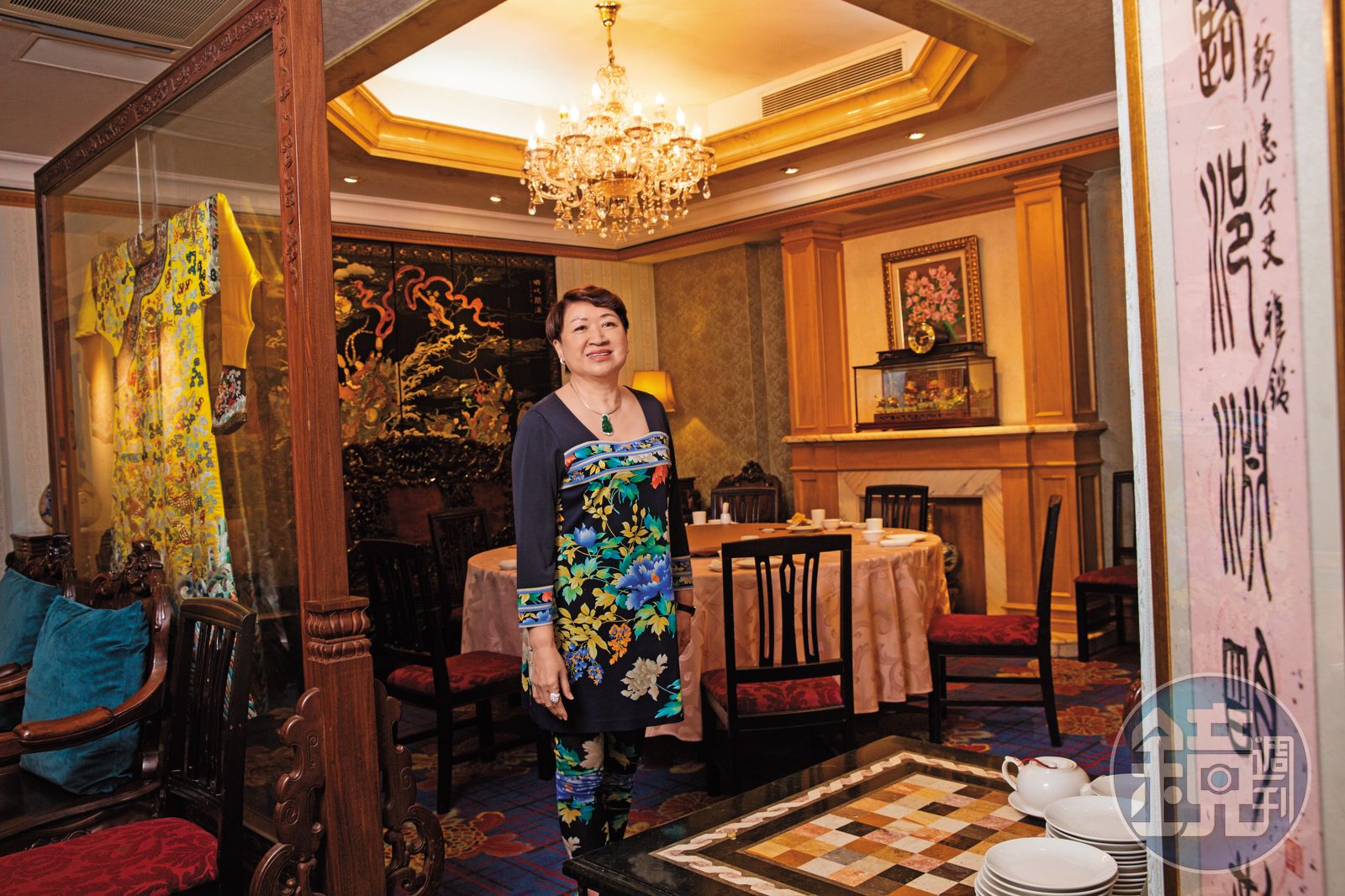 今年70歲的大三元酒樓董事長邱靜惠一身珠寶華服,踩著高跟鞋盡顯雍容華貴,她笑容滿面地穿梭在各包廂,逐一詢問:「董仔,今天的菜口味還行嗎?」不少客人主動要求合照,所到之處,如巨星般掀起一陣騷動。