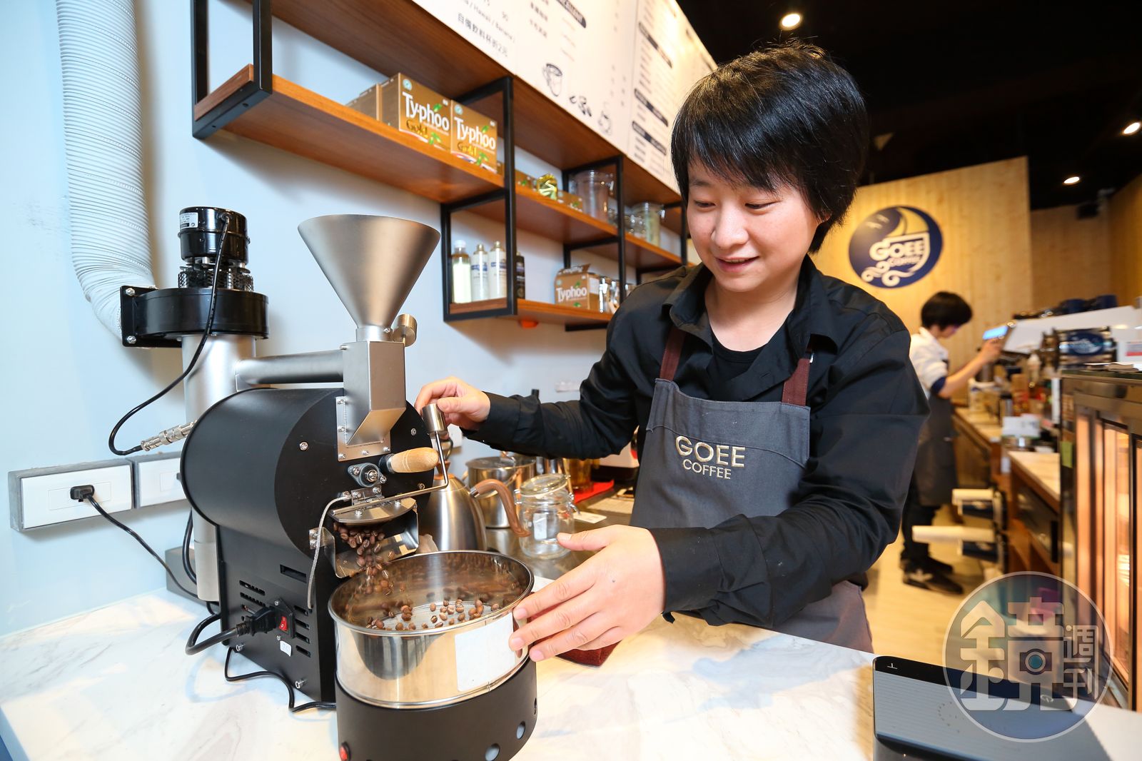吧台上小型烘豆機散發迷人烘豆香氣,有別於商業氣息較濃厚的丹堤連鎖咖啡,方淑宜所創的第二個連鎖咖啡品牌GOEE勾癮咖啡,寶藍色簡約招牌、溫暖木作裝潢層架,擺上巴西、哥斯大黎加、肯亞各產區精品生豆,三不五時有咖啡迷和專業咖啡師切磋交流。