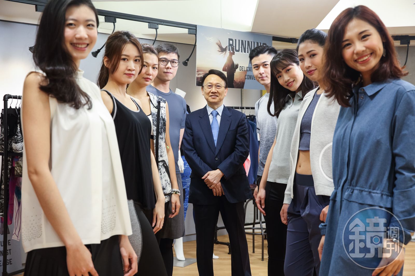 穿著可透過手機裝置,借助外接行動電源轉換熱能,自行調節溫度最高達42度的智慧溫控外套,周理平站在一群平均年齡不到30歲的同仁間拍照,扮起自家產品的模特兒,一點也不生疏。