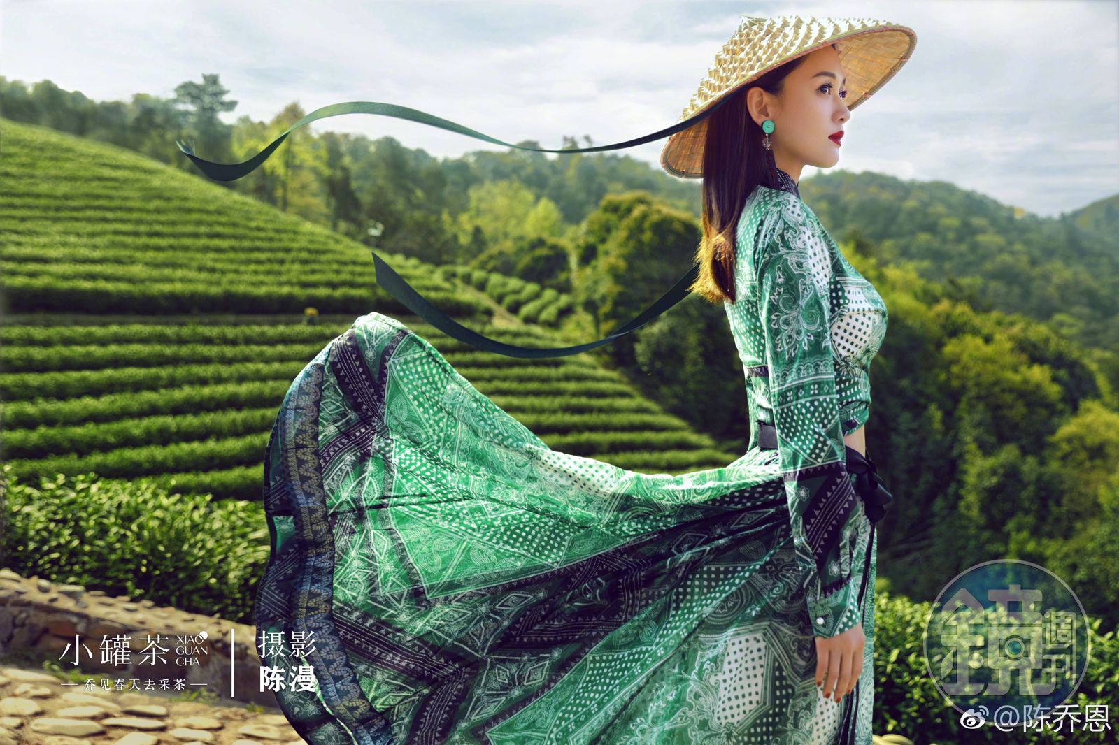 在一片茶山中,陳喬恩戴著斗笠卻充滿時尚大片fu!(翻攝自陳喬恩微博)發布時間:2018.04.13 16:13 臺北時間