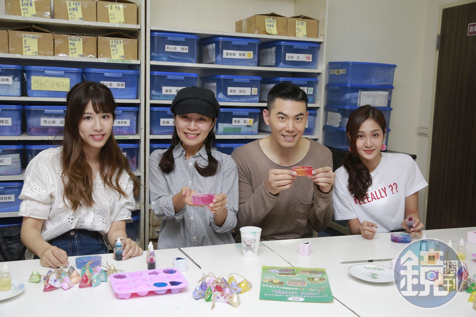 擅長烘焙的于齊優做起香皂可是一點都不馬虎,挑選洋甘菊精油倒入熱皂,快速俐落,還與媽媽「母女聯手」一起混色倒入模具,方文琳說自己對於這樣細緻手工,真的是屬於手很不巧的人,一個一個步驟慢慢做,還是沒有女兒那麼厲害。邱子芯也超興奮,挑選了最喜歡的玫瑰色染劑再加上玫瑰味道,就做成一個很像她的手工香皂,也笑說自己像小孩子,整個手都沾了染劑。