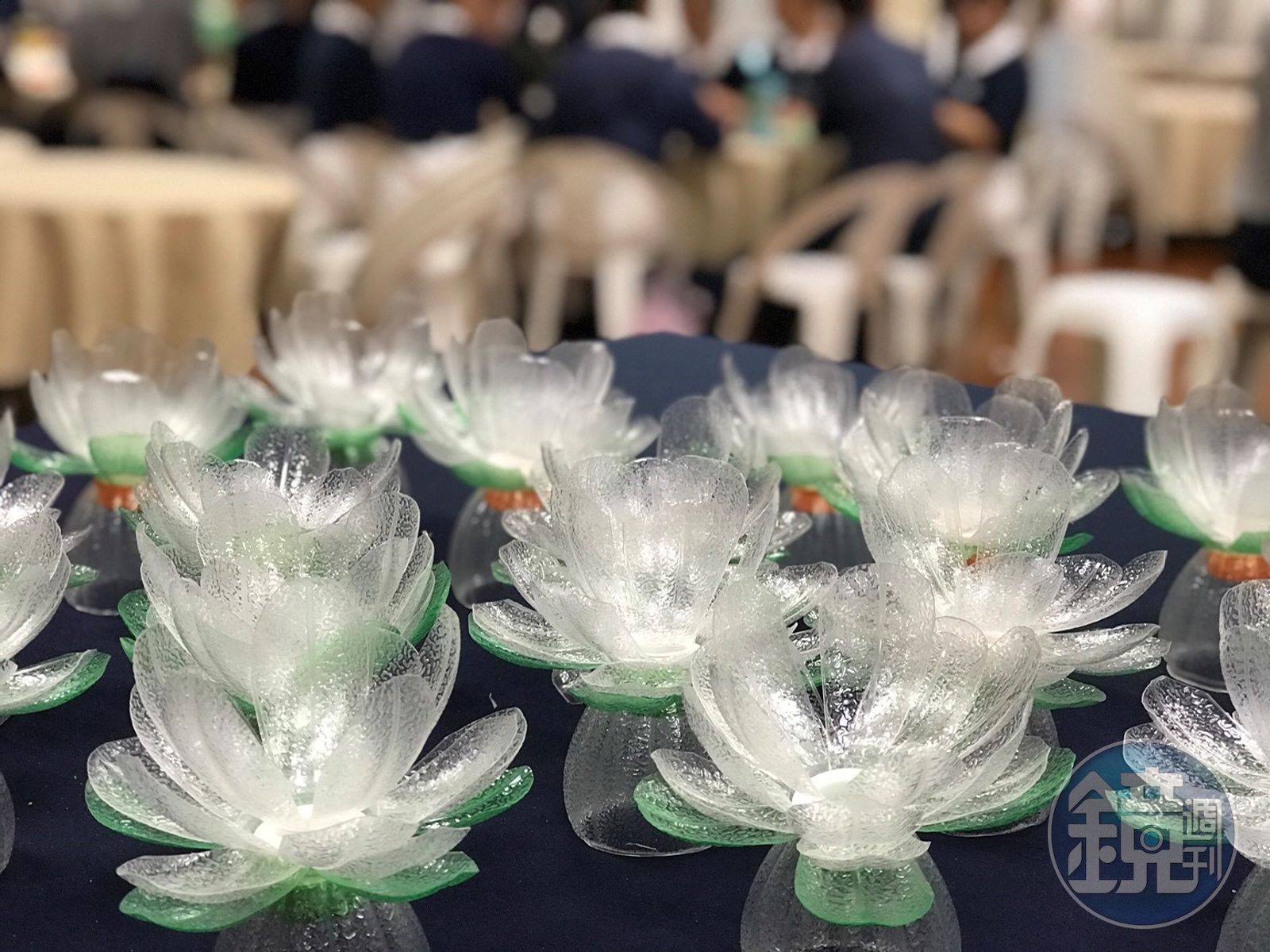 慈濟基金會表示,這款環保蓮花是由內湖的環保教育站設計製作,每盞環保蓮花都用5支回收而來的寶特瓶製作而成,團隊從去年夏天就開始蒐集合適的寶特瓶,除了清洗與裁切外,還需要讓成品保持圓角以免割傷手,製作過程相當繁複。