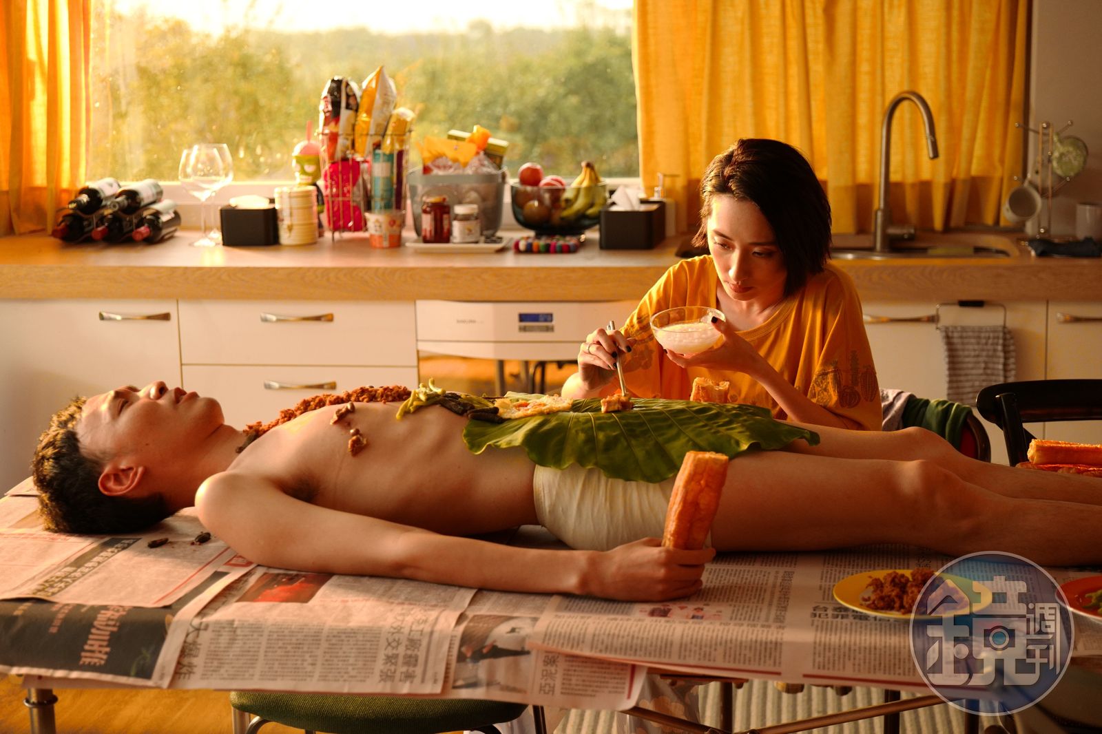 柯佳嬿在電影裡為愛情大師程見的經紀人女友MIUMIU,片中她在張少懷的裸體上擺滿清粥小菜來享用早餐,2人甚至互咬油條至直逼接吻來調情。