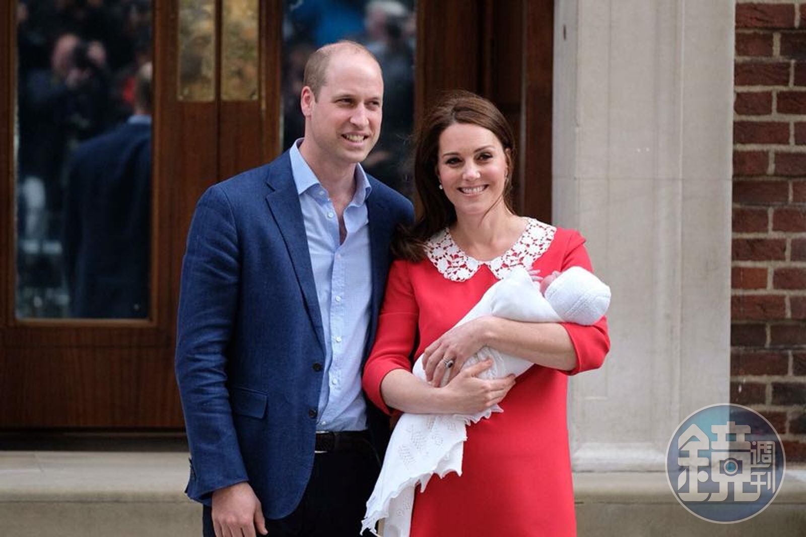 凱特王妃產後氣色看起來不錯,身穿紅洋裝腳踩高跟鞋,懷裡抱著被包裹在白色布巾的小王子,與威廉一同對群眾與媒體揮手致意,並接受群眾熱情歡呼。被問及小王子名字時,威廉表示「你們遲早會知道。」同時笑稱現在麻煩有3個了。