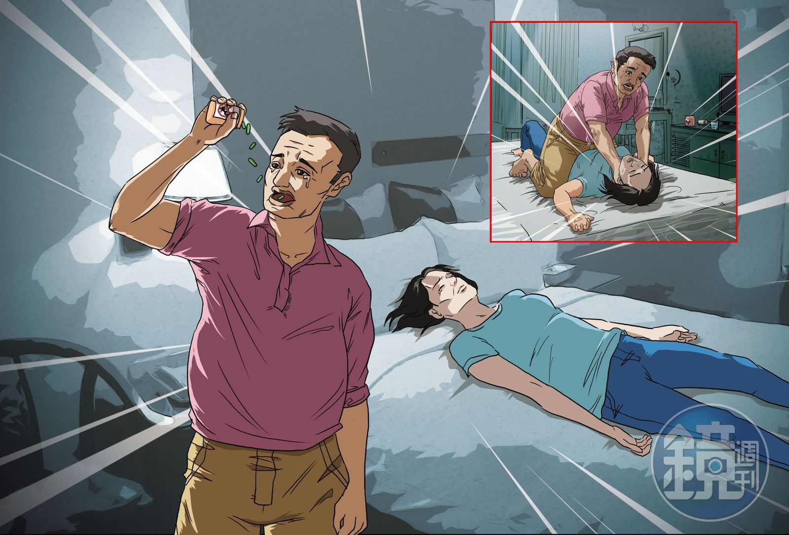警消破門時,蔡男和43歲的妹妹皆仰躺在臥室床上,蔡女脖子有明顯瘀痕,已無生命跡象,吞藥試圖自殺的蔡男則意識昏迷,警消連忙將他送往雙和醫院急救,所幸保住一命。